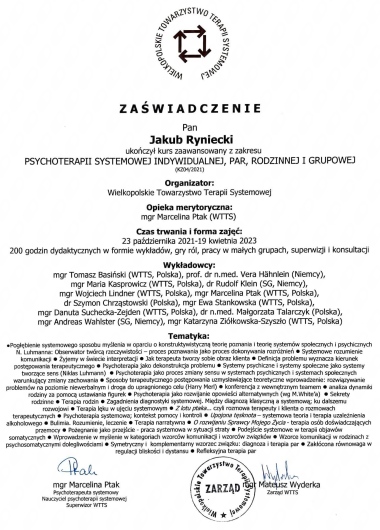 Pan Jakub jest bardzo empatyczną osobą, w spokojny i delikatny sposób prowadzi rozmowę i zadaje bardzo trafne pytania, zostawiając jednocześnie miejsce na pracę własną pacjenta, jego refleksję nad problemem. Jestem bardzo zadowolona ze spotkań i widzę ich pozytywny efekt.