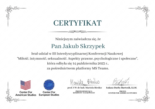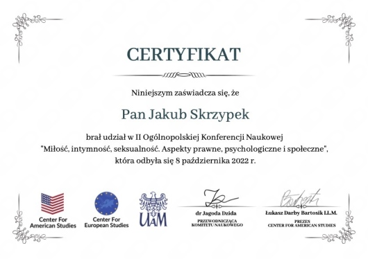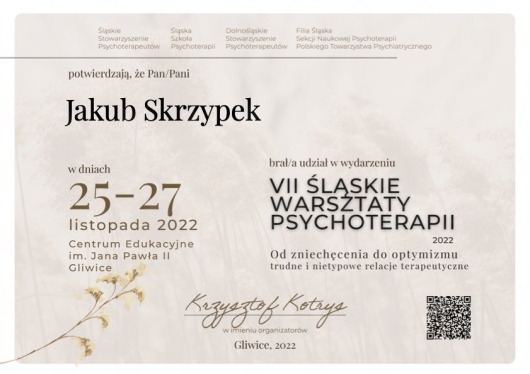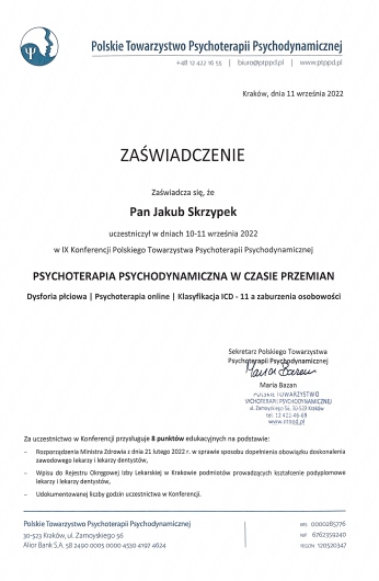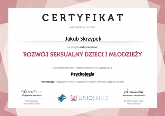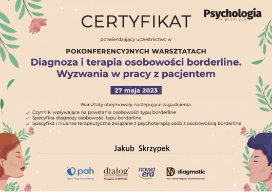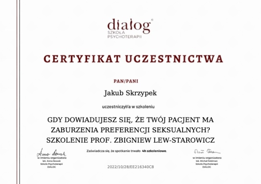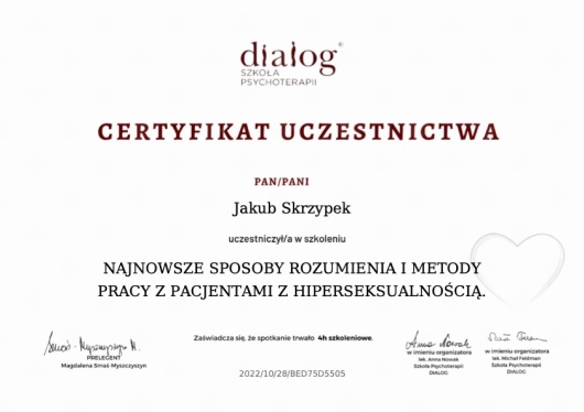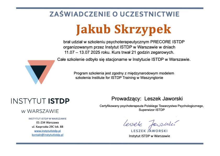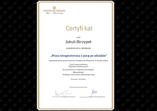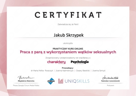 Uzupełniając kompetencje zawodowe, ukończyłem studia podyplomowe z zakresu seksuologii, terapii rodzin i par, psychotraumatologii, psychoonkologii, psychologii zdrowia i psychodietetyki, co pozwala mi spojrzeć na problemy pacjenta holistycznie – zarówno w sferze emocjonalnej, relacyjnej, seksualnej jak i somatycznej. Ukończyłem także szkolenie ISTDP precore, TSR (pierwszy stopień).