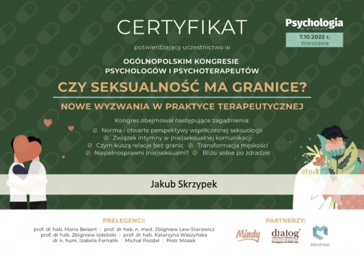 Jestem psychologiem, psychoterapeutą, dyplomowanym seksuologiem i terapeutą par.