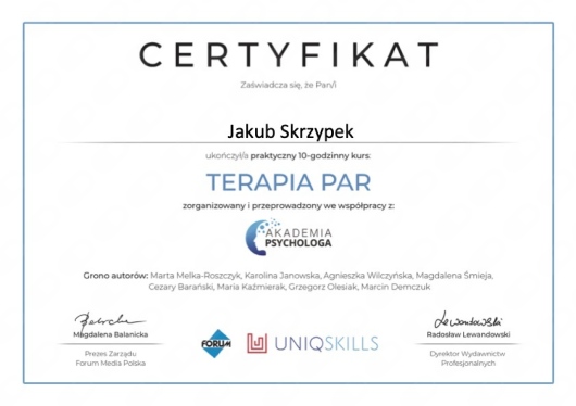 Gorąco polecamy Pana Jakuba jako terapeutę par. Przyszliśmy do niego z dwoma głównymi problemami: trudnościami w komunikacji oraz kwestiami intymnymi, które znacząco wpływały na nasze życie związkowe.