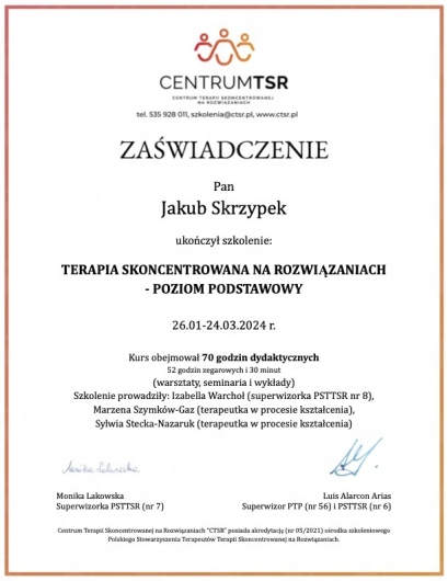 * Regularnie poddaję się superwizji zawodowej i stale doskonalę kompetencje poprzez kursy i konferencje.