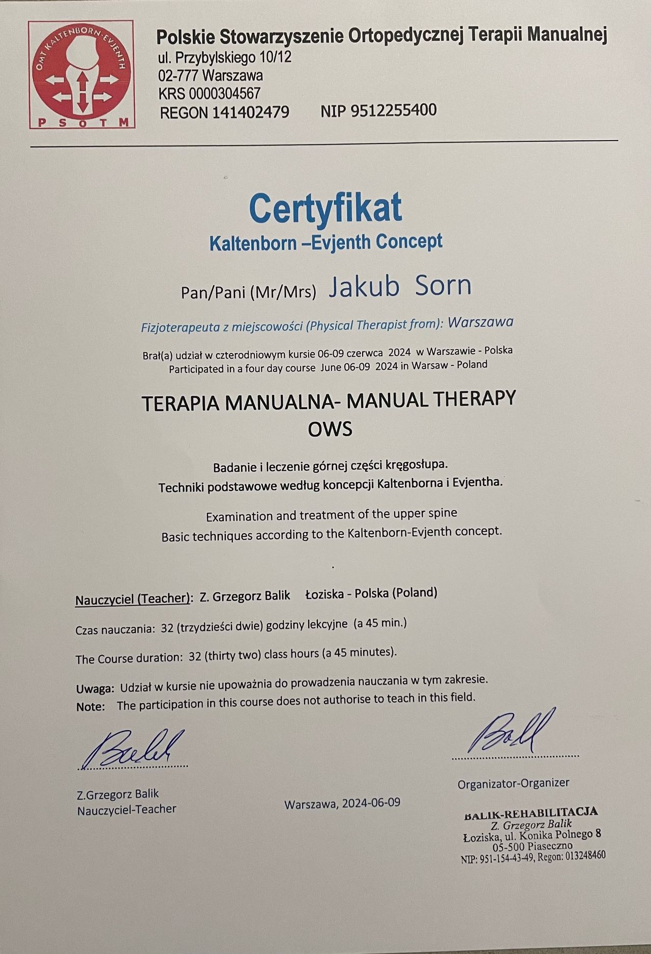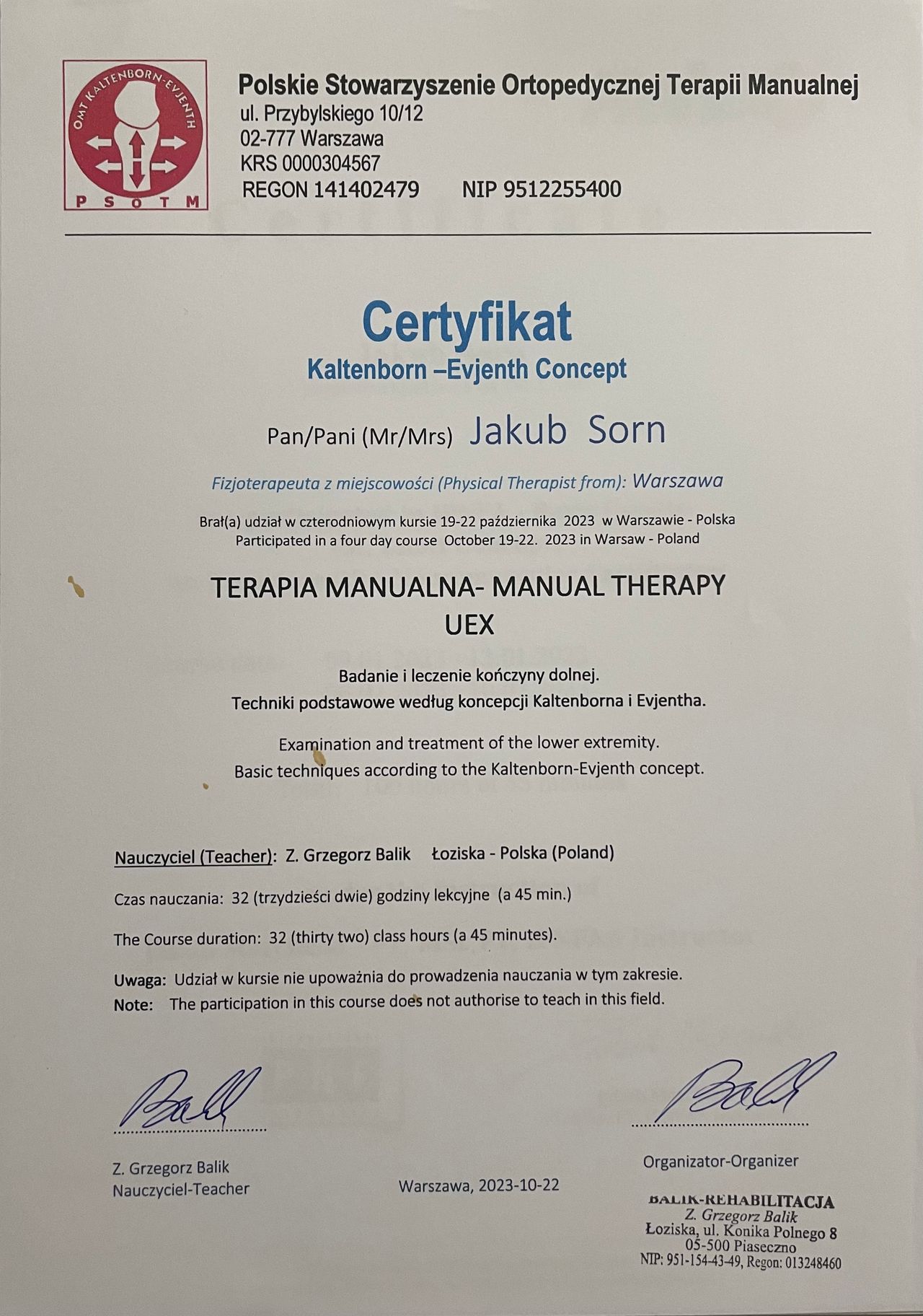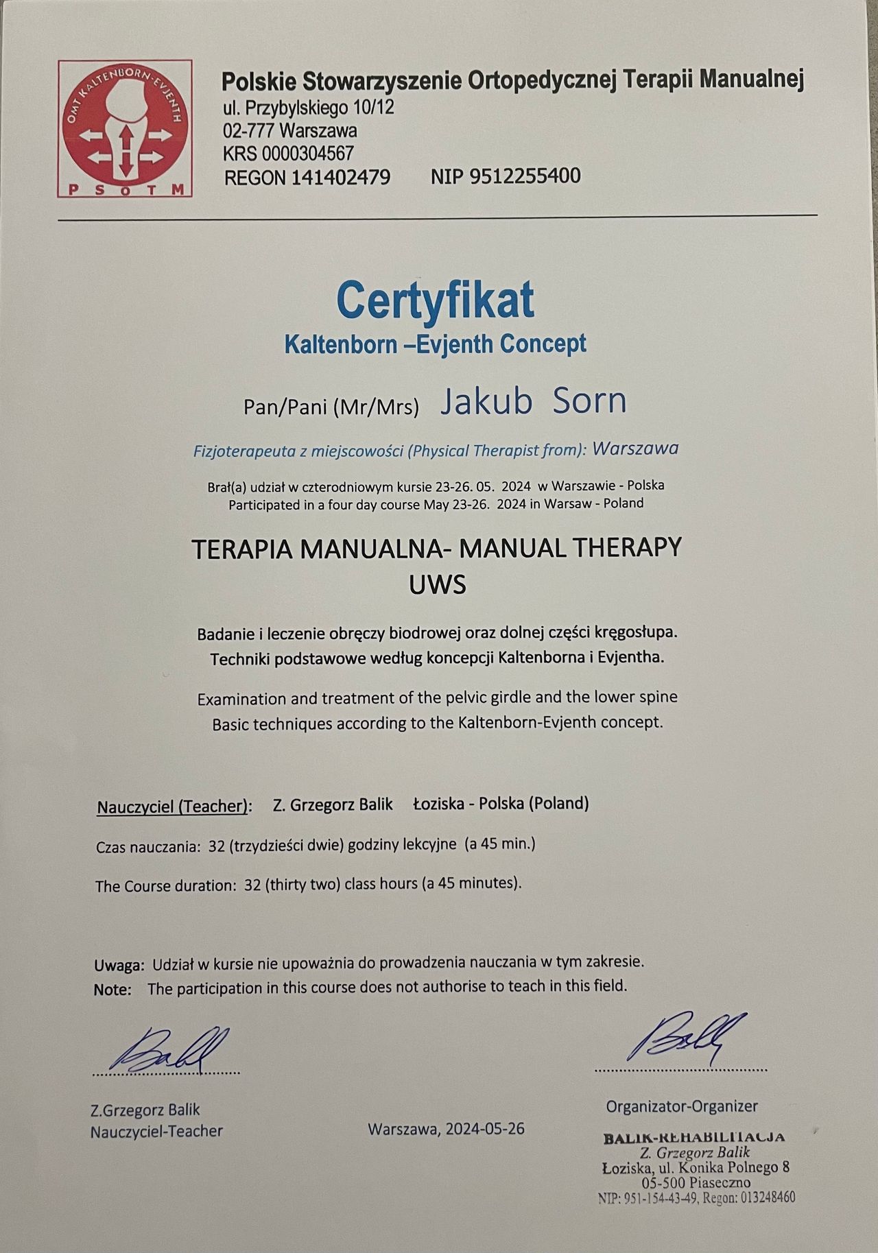 Ortopedyczna Terapia Manualna - OMT KALTENBORN-EVJENTH (ukończone moduły OWS, UWS, OEX, UEX)