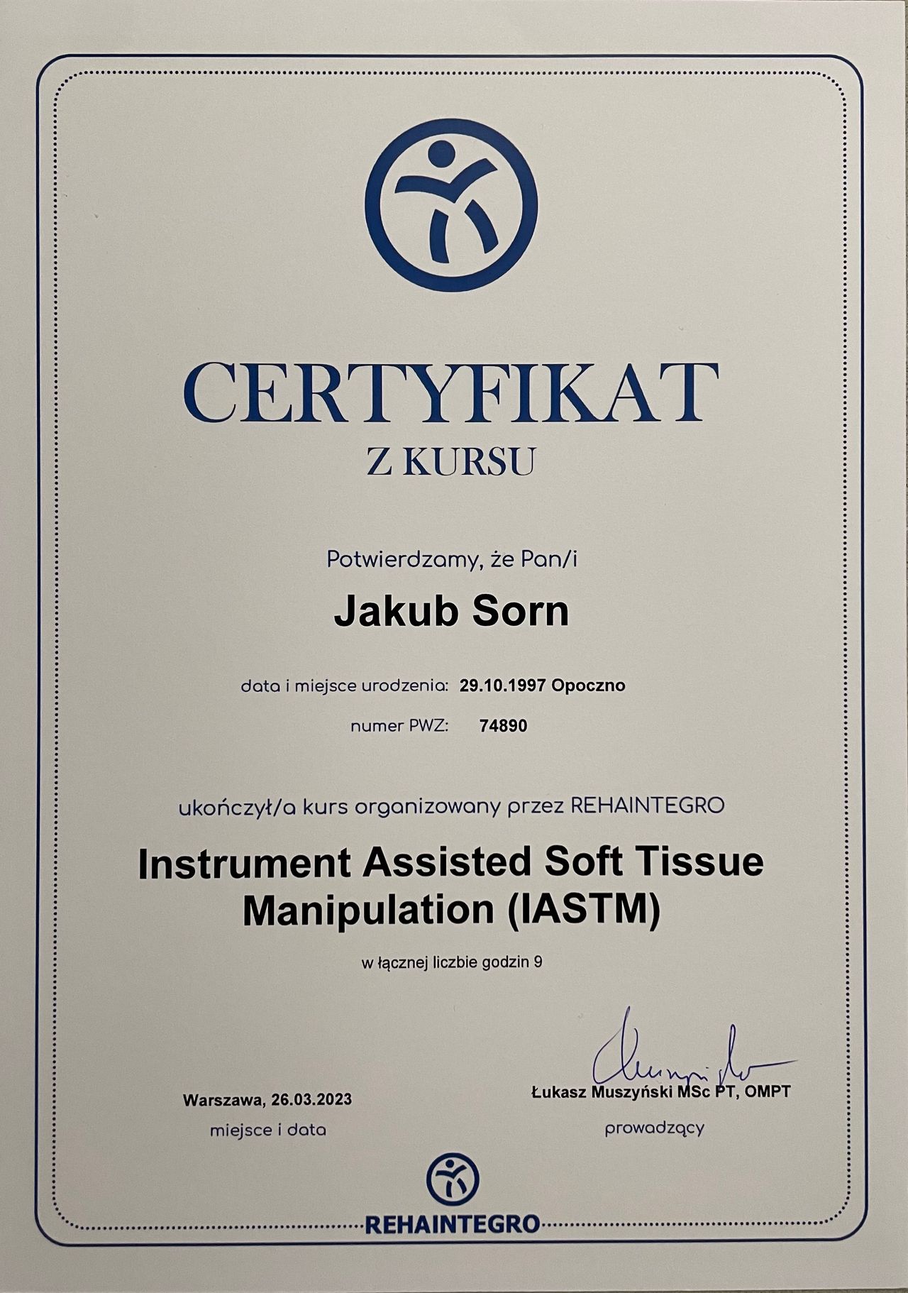 Magister fizjoterapii, absolwent Warszawskiego Uniwersytetu Medycznego. Specjalizuje się w rehabilitacji ortopedycznej, neurologicznej oraz terapii manualnej. W swojej pracy stosuje indywidualne podejście do każdego pacjenta, co pozwala na dostosowanie planu rehabilitacyjnego do jego potrzeb. Regularnie uczestniczy w szkoleniach i warsztatach, by być na bieżąco z nowinkami w zakresie fizjoterapii.