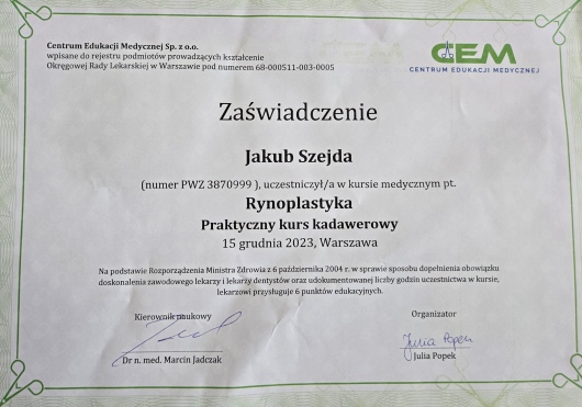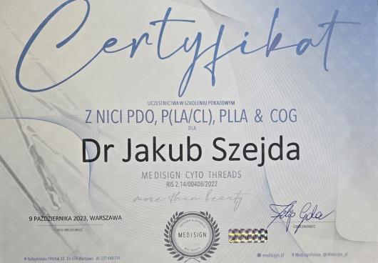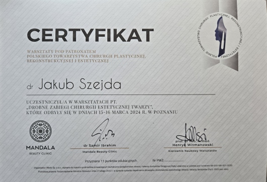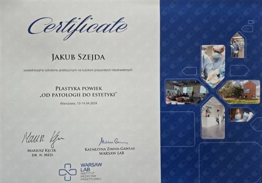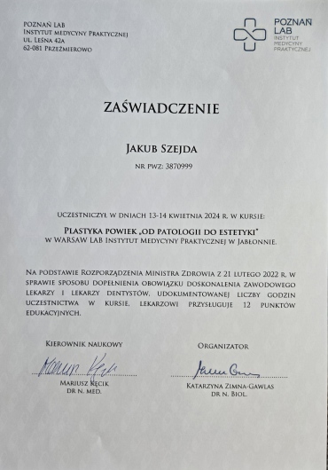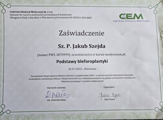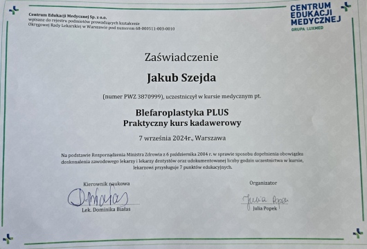 Lekarz,pan Jakub Szejda wykazał się pełnym profesjonalizmem podczas wykonywania u mnie zabiegu blefaroplastyki.Przyjazny dla pacjenta,miły,delikatny i troskliwy.Po kolei objaśniał wykonywane podczas zabiegu czynności.Zabieg przebiegł bezboleśnie i sprawnie w miłej atmosferze.Efekt końcowy zadowalający,lepiej widzę,a przy okazji i chyba wyglądam.Serdecznie dziękuję i polecam pana doktora innym pacjentom.