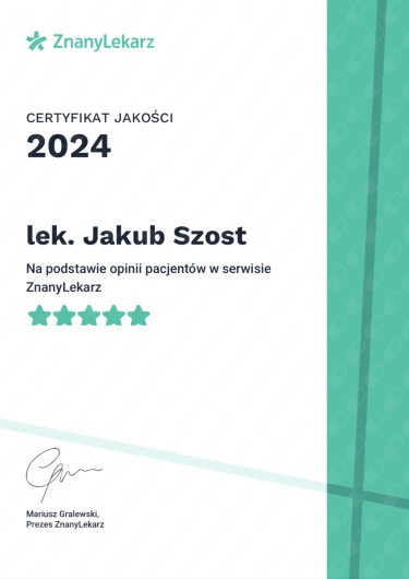 Jak Jakub Szost umawia wizyty?Jakub Szost używa kalendarza ZnanyLekarz, dlatego na stronie widzisz aktualne terminy. Wystarczy, że wybierzesz datę i godzinę, które odpowiadają Ci najbardziej. Umawianie wizyty jest darmowe, a tuż przed terminem wyślemy Ci przypomnienie.