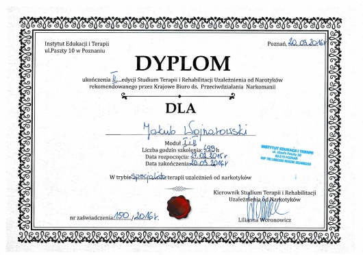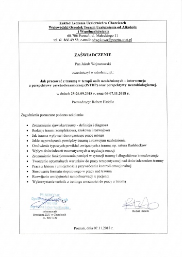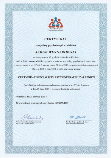 Jestem członkiem Koła Warszawskiego Psychoanalizy NLS oraz certyfikowanym specjalistą psychoterapii uzależnień. Poza terapią dla osób nadużywających substancji psychoaktywnych, uzależnionych i ich bliskich, oferuję także pomoc osobom w kryzysie życiowym, cierpiącym z powodu lęków, nerwicy, trudności w kontaktach z innymi osobami oraz objawów psychosomatycznych. Posiadam wieloletnie doświadczenie pracy w placówkach zdrowia psychicznego i leczenia uzależnień. Uczestniczyłem w szkoleniach, seminariach i wykładach z zakresu psychologii, psychoterapii, analizy transakcyjnej, psychoanalizy brytyjskiej oraz psychoanalizy szkoły Lacanowskiej.