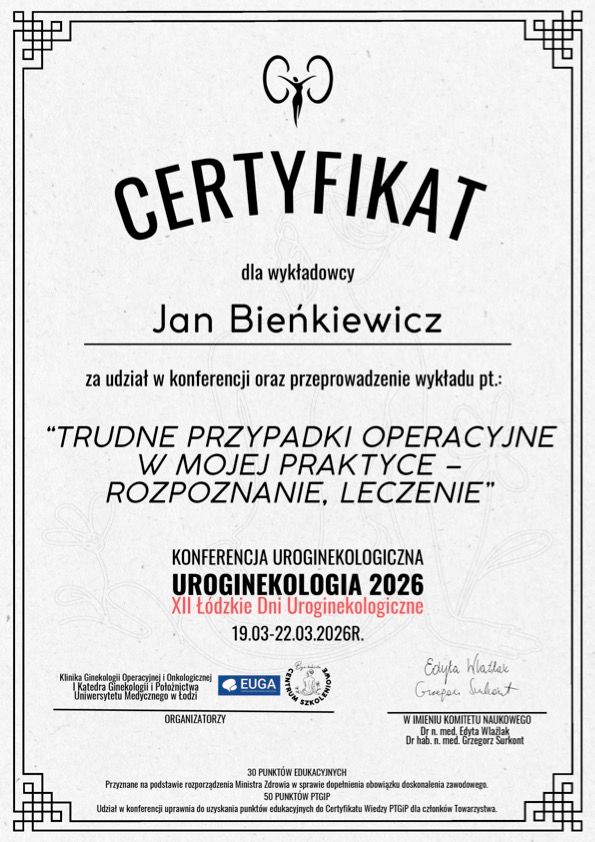 Regularnie podnoszę swoje kwalifikacje podczas szkoleń i kursów organizowanych zarówno w kraju jak i za granicą, ze szczególnym uwzględnieniem uroginekologii i nowoczesnych technik operacyjnych.