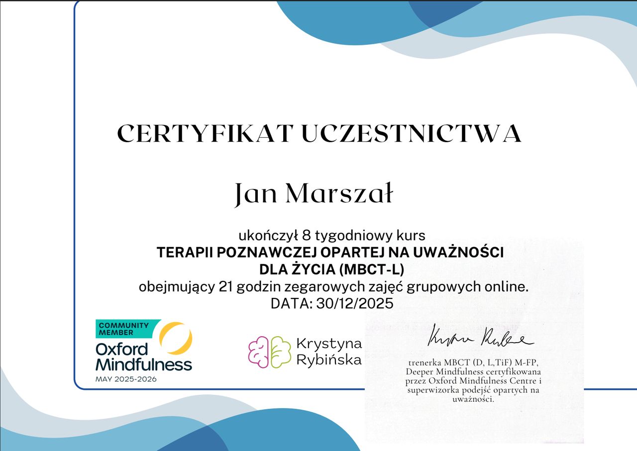 Pan Jan Marszał jest absolutnym fachowcem w swojej dziedzinie. Przychodząc do Pana Jana po doświadczeniach z innymi psychologami miło się zaskoczyłem tym w jaki sposób Pan Jan był w stanie wytłumaczyć mi niektóre koncepty i skuteczność wizyt. Absolutnie polecam.
