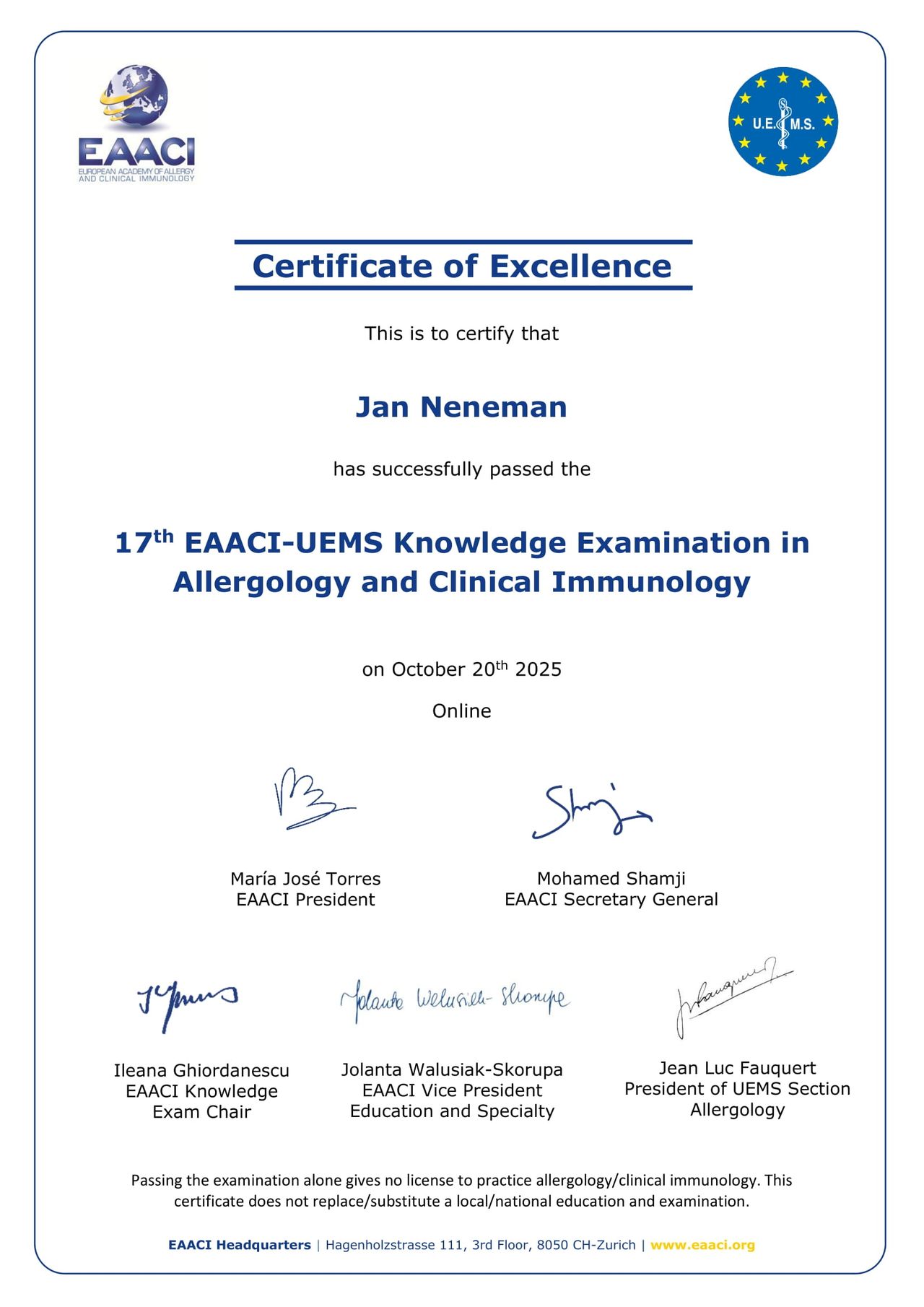W październiku 2025 roku zdałem 17th EAACI–UEMS Knowledge Examination in Allergology and Clinical Immunology.