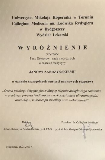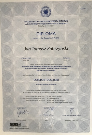 Ukończyłem studia wyższe na kierunku lekarskim w Collegium Medicum Uniwersytetu Mikołaja Kopernika w Toruniu. W latach 2011-2012 brałem udział w wymianie studenckiej w ramach programu ERASMUS. Stopień doktora nauk medycznych otrzymałem w 2018 roku, na podstawie osiągnięcia pt. ”Ocena patologii ścięgna głowy długiej mięśnia dwugłowego ramienia w przebiegu procesu tendinopatii z wykorzystaniem ultrasonografii, artroskopii, mikroskopii świetlnej oraz elektronowej”, rozprawa została wyróżniona przez Radę Wydziału Lekarskiego CM UMK.
