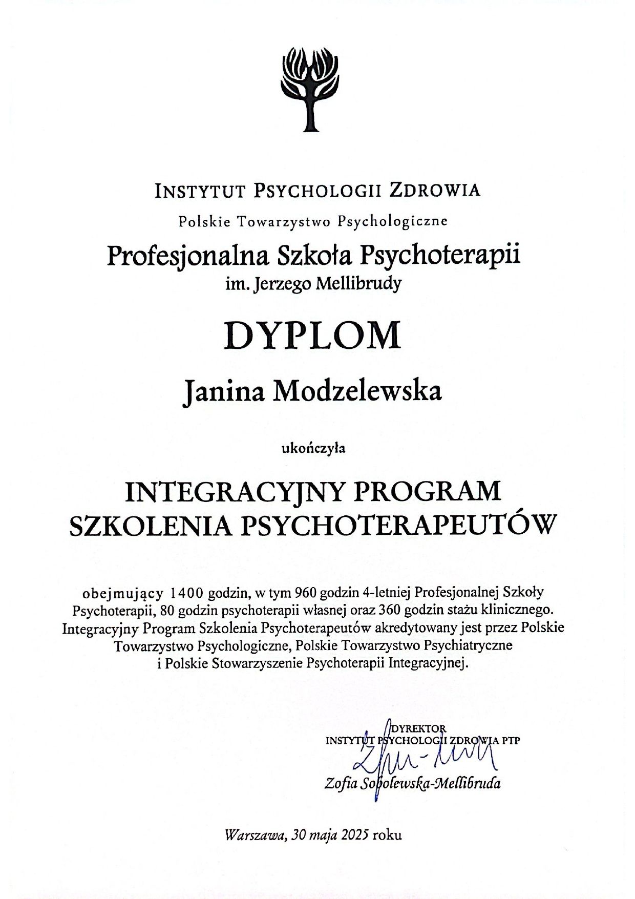 Ukończyłam 4-letnie szkolenie psychoterapeutyczne w Profesjonalnej Szkole Psychoterapii Instytutu Psychologii Zdrowia w ramach Integracyjnego Programu Szkolenia Psychoterapeutów, akredytowanego przez Polskie Towarzystwo Psychologiczne, Polskie Towarzystwo Psychiatryczne i Polskie Stowarzyszenie Psychoterapii Integracyjnej.