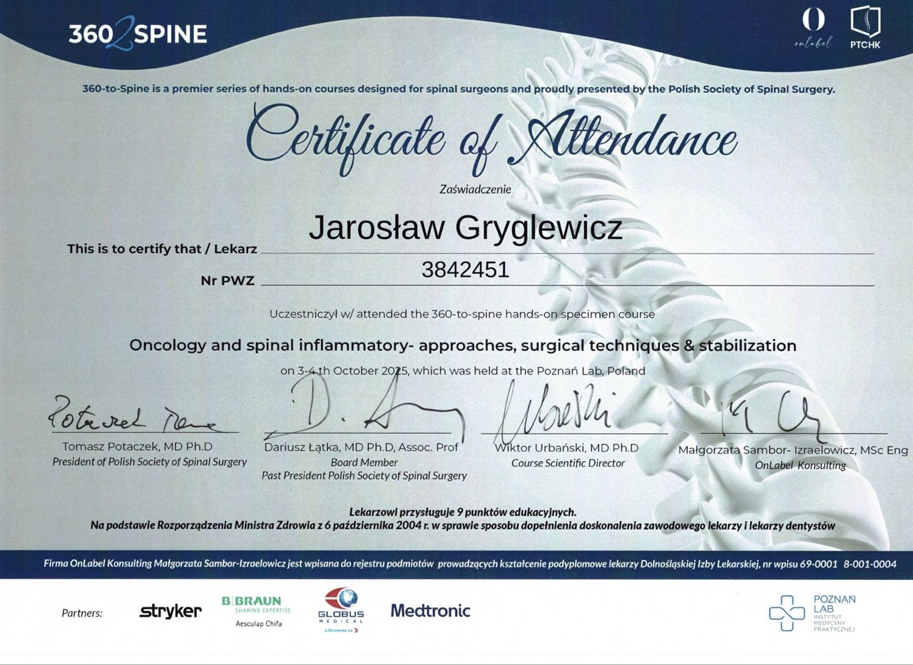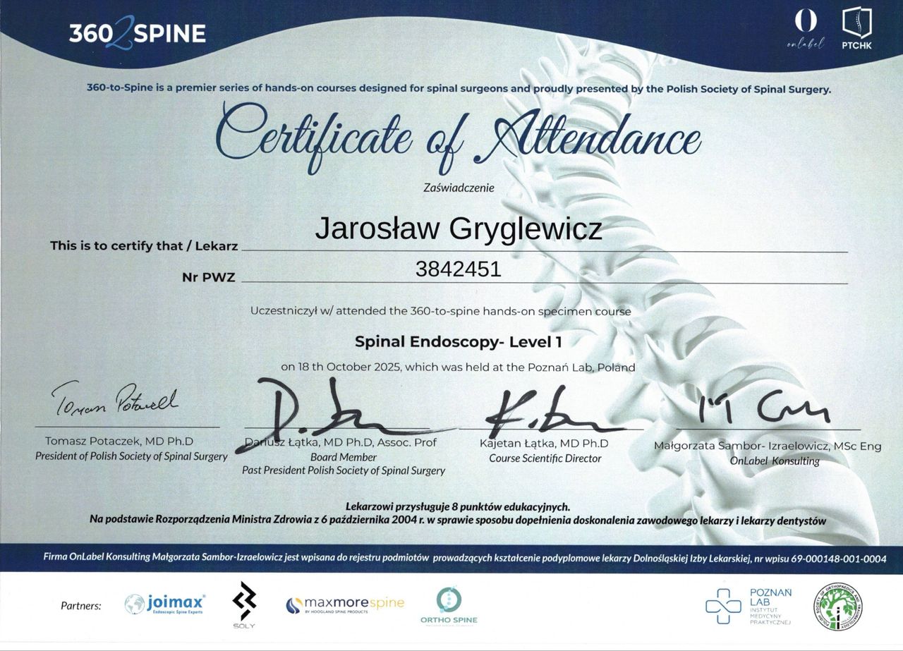 Trzymiesięczny staż w oddziałach zajmujących się chirurgią kręgosłupa. Aktywny udział w kilkudziesięciu operacjach z zakresu chirurgii kręgosłupa.
