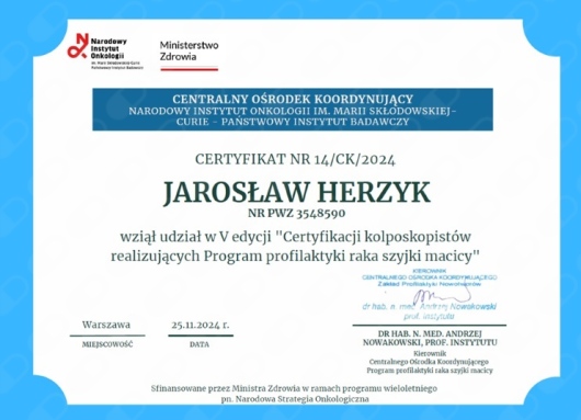 Certyfikowany Kolposkopista Polskiego Towarzystwa Kolposkopii i Patofizjologii Szyjki Macicy (PTKiPSM) Nr KLP/334/3