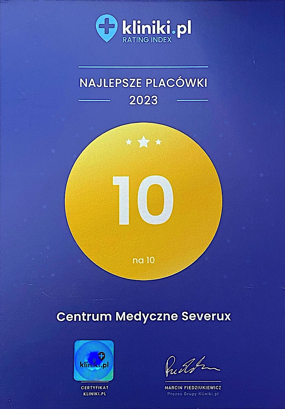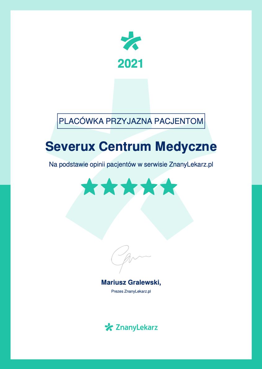 Centrum Medyczne Severux działa w ramach dwóch placówek zlokalizowanych w Chorzowie (ul. Katowicka 157) oraz w nowej placówce w Świętochłowicach (ul. Sikorskiego 1), znajdującej się bezpośrednio przy zjeździe z Drogowej Trasy Średnicowej. Zespół naszych specjalistów liczy ponad 100 osób i stale się powiększa. To fantastyczni ludzie - kompetentni i empatyczni, traktujący pacjenta z szacunkiem i troską. Znajdziesz u nas m.in. szybkie terminy konsultacji, aparaturę medyczną najwyższej jakości, umiarkowane ceny, łatwy dojazd i duży osobny parking. Zapraszamy do skorzystania z prywatnych konsultacji w następujących specjalnościach: alergologia, akupunktura, chirurgia naczyniowa i ogólna, dermatologia, diabetologia, dietetyka, endokrynologia, fizjoterapia, ginekologia, hematologia, interna, kardiologia, laryngologia, medycyna estetyczna, medycyna pracy, neurologia, okulistyka, onkologia, optometria, ortodoncja, ortopedia, pediatria, podologia, poradnia leczenia bólu, poradnia leczenia ran przewlekłych, poradnia leczenia stopy cukrzycowej, pracownia USG, psychiatria, psychologia, reumatologia, stomatologia i urologia. W placówce w Świętochłowicach działa też punkt pobrań oraz pracownia radiologii stomatologicznej. Do zobaczenia w CM Severux! : )
