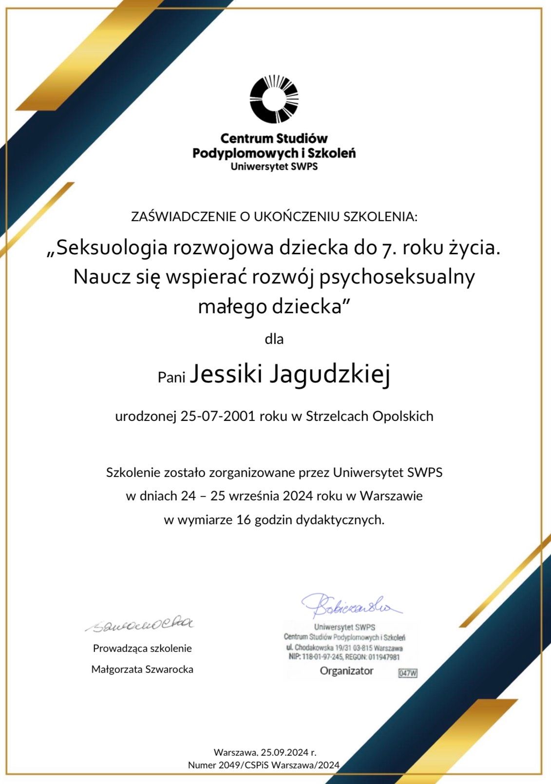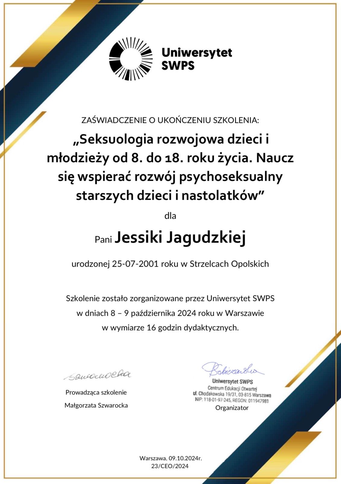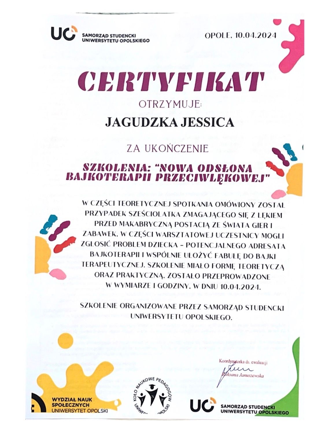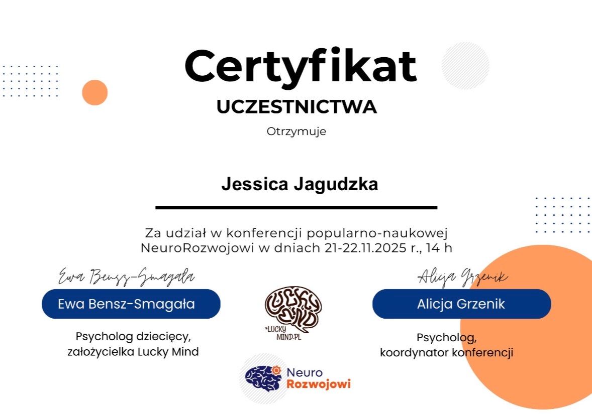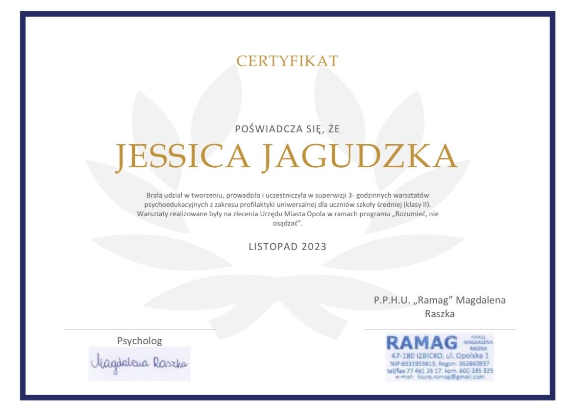 Mam przygotowanie pedagogiczne i doświadczenie w pracy z dziećmi, młodzieżą oraz dorosłymi. Prowadzę poradnictwo psychologiczne, TUS, warsztaty psychoedukacyjne oraz wspieram osoby neuroatypowe. Ukończyłam psychologię kliniczną na Uniwersytecie Opolskim oraz kursy z Racjonalnej Terapii Zachowania i seksuologii rozwojowej. Obecnie kształcę się w seksuologii klinicznej.