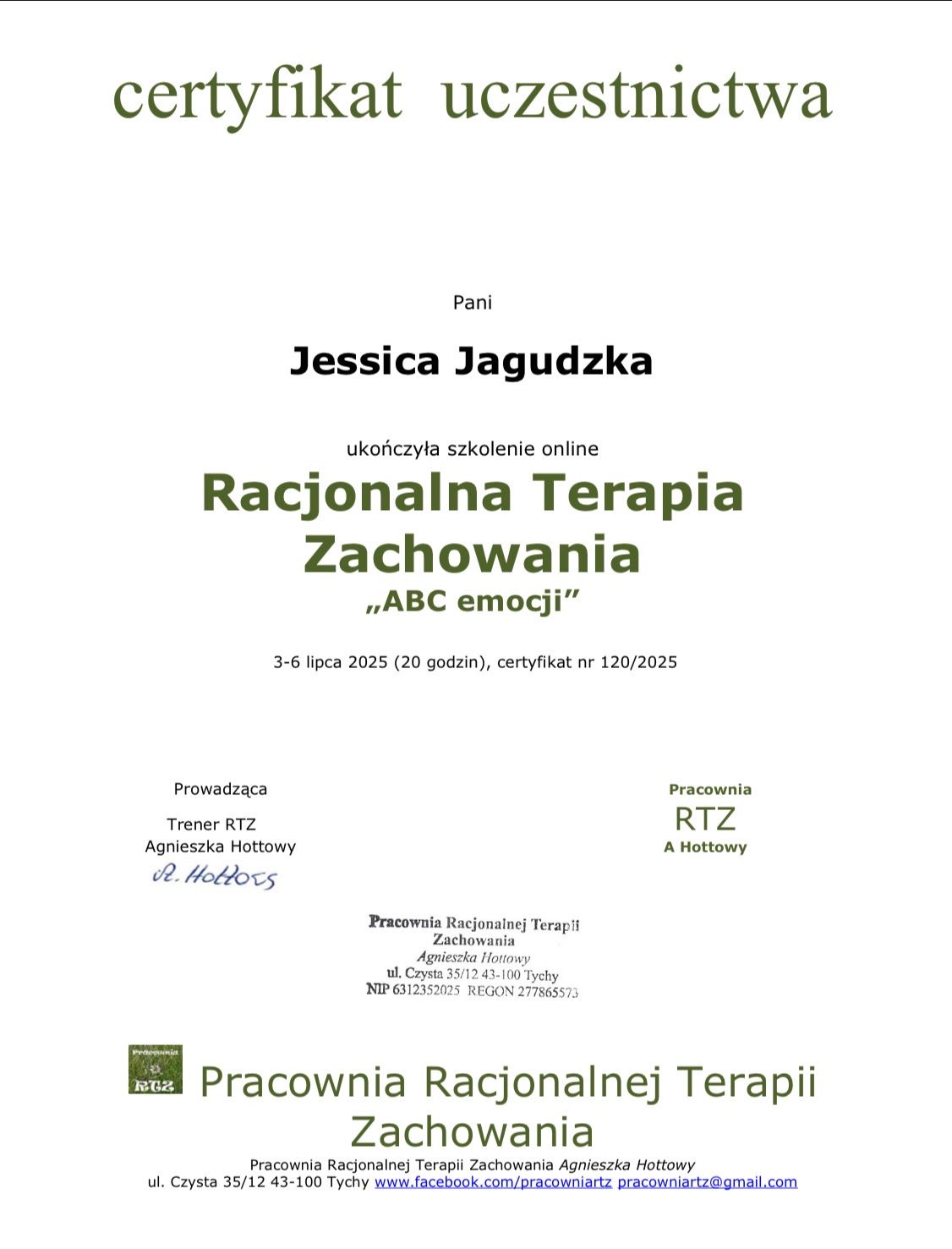 Gdzie Jessica Jagudzka ma swój gabinet?Jessica Jagudzka nie ma określonego adresu gabinetu. Możliwe, że Jessica Jagudzka przyjmiuje tylko online lub nie chce podawać dokładnego adresu.