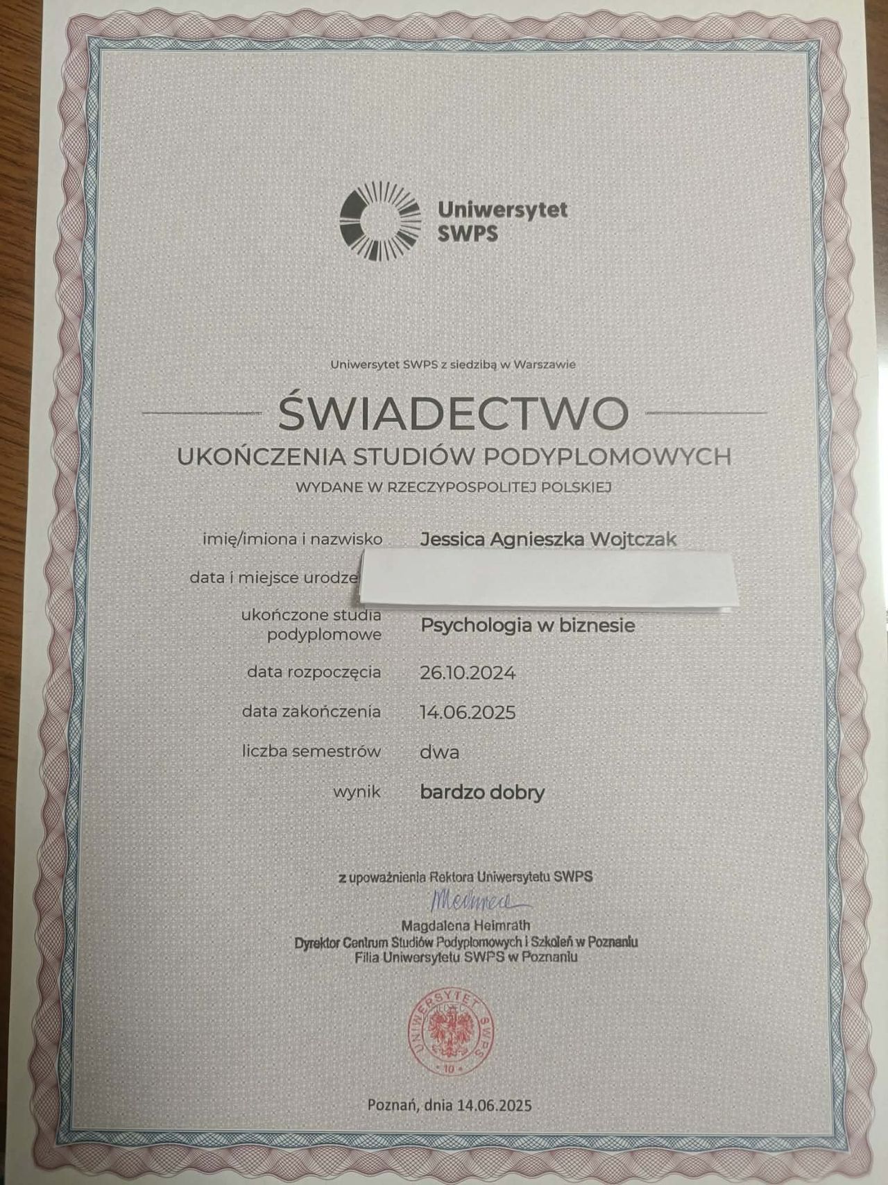 Ukończyłam studia podyplomowe Psychologia Dziecka na Uniwersytecie SWPS w Poznaniu