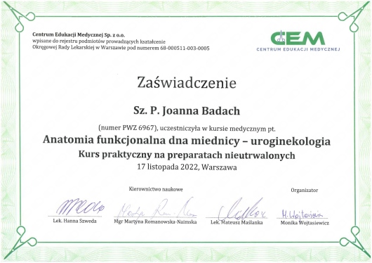 Polecam wizytę u Pani Joanny. Bardzo profesjonalne podejście do pacjenta. Była to wizyta z zakresu urofizjoginekologii, nie czułam się w żaden sposób skrępowana. Pani magister odpowiedziała na wszystkie moje pytania, zaleciła ćwiczenia do wykonania w domu. Wizyta przebiegała w bardzo przyjaznej atmosferze. Polecam