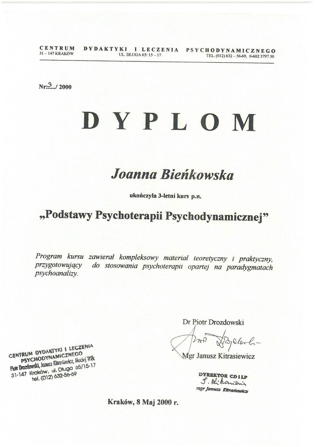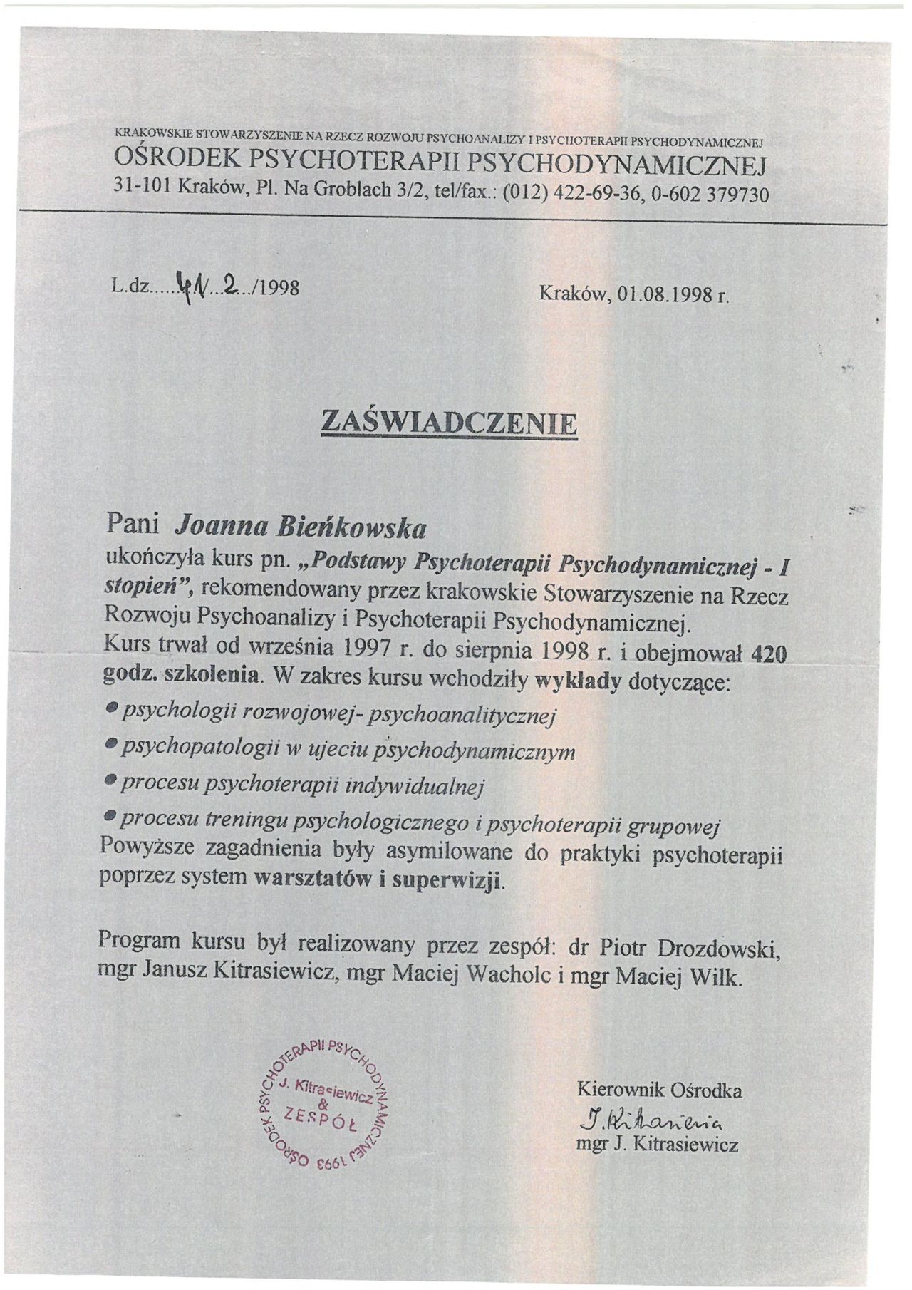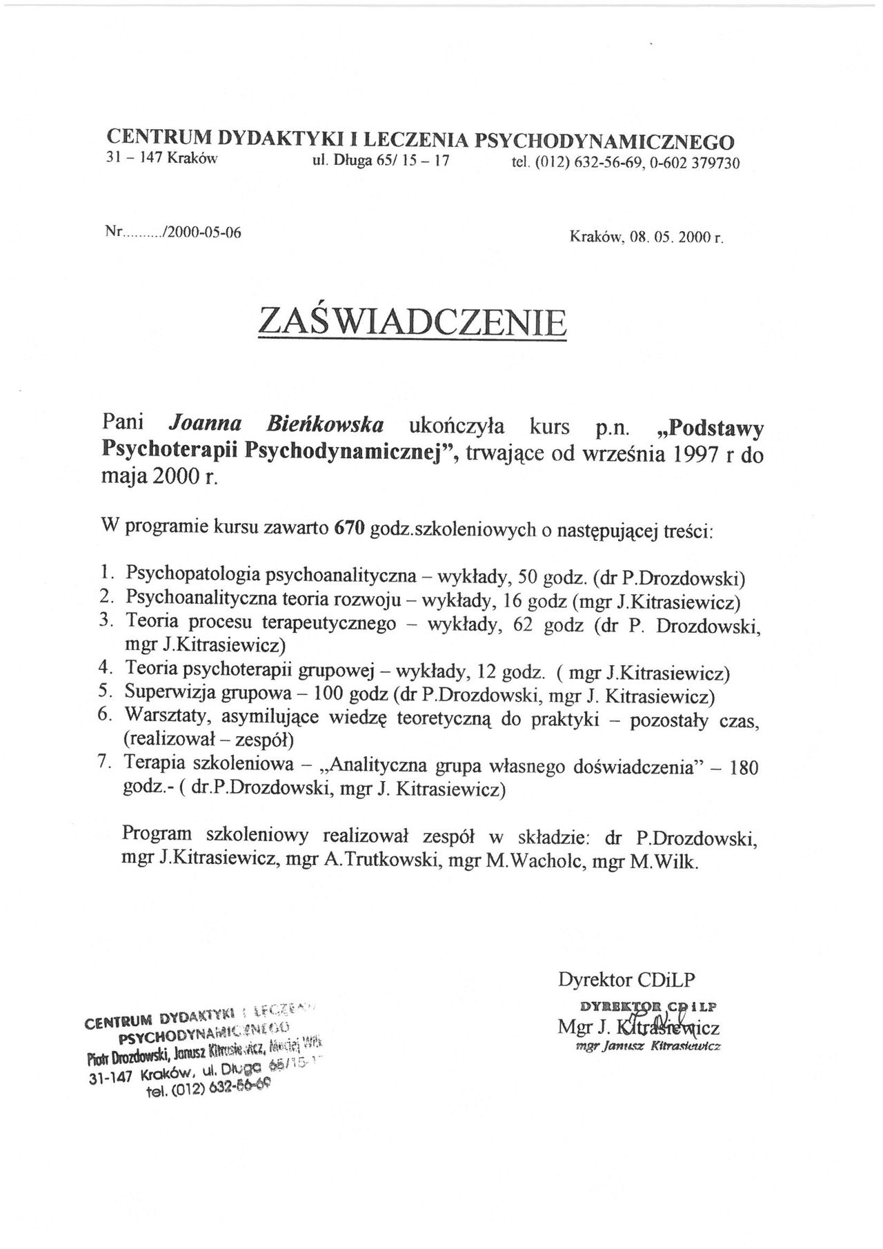 Jestem pedagogiem, psychologiem, socjoterapeutą oraz psychoterapeutą psychodynamicznym w procesie certyfikacji. Kurs Psychoterapii Psychodynamicznej ukończyłam w Centrum Doskonalenia i Leczenia Psychodynamicznego w Krakowie (obecnie KCP) w 2000 roku. Ukończyłam studia podyplomowe z Wychowania prorodzinnego i seksualnego, Psychologii zwierząt oraz szkolenia z Socjoterapii i Psychologicznego Treningu Grupowego. Brałam również udział w kursach Seksuologii w Centrum Medycznym Kształcenia Podyplomowego oraz w wielu kursach doszkalających dla psychologów i psychoterapeutów. Jestem członkiem Polskiego Towarzystwa Psychoterapii Psychodynamicznej. Jako psychoterapeuta, dbając o siebie i moich Pacjentów, biorę udział w regularnych superwizjach indywidualnych i grupowych oraz terapii własnej.