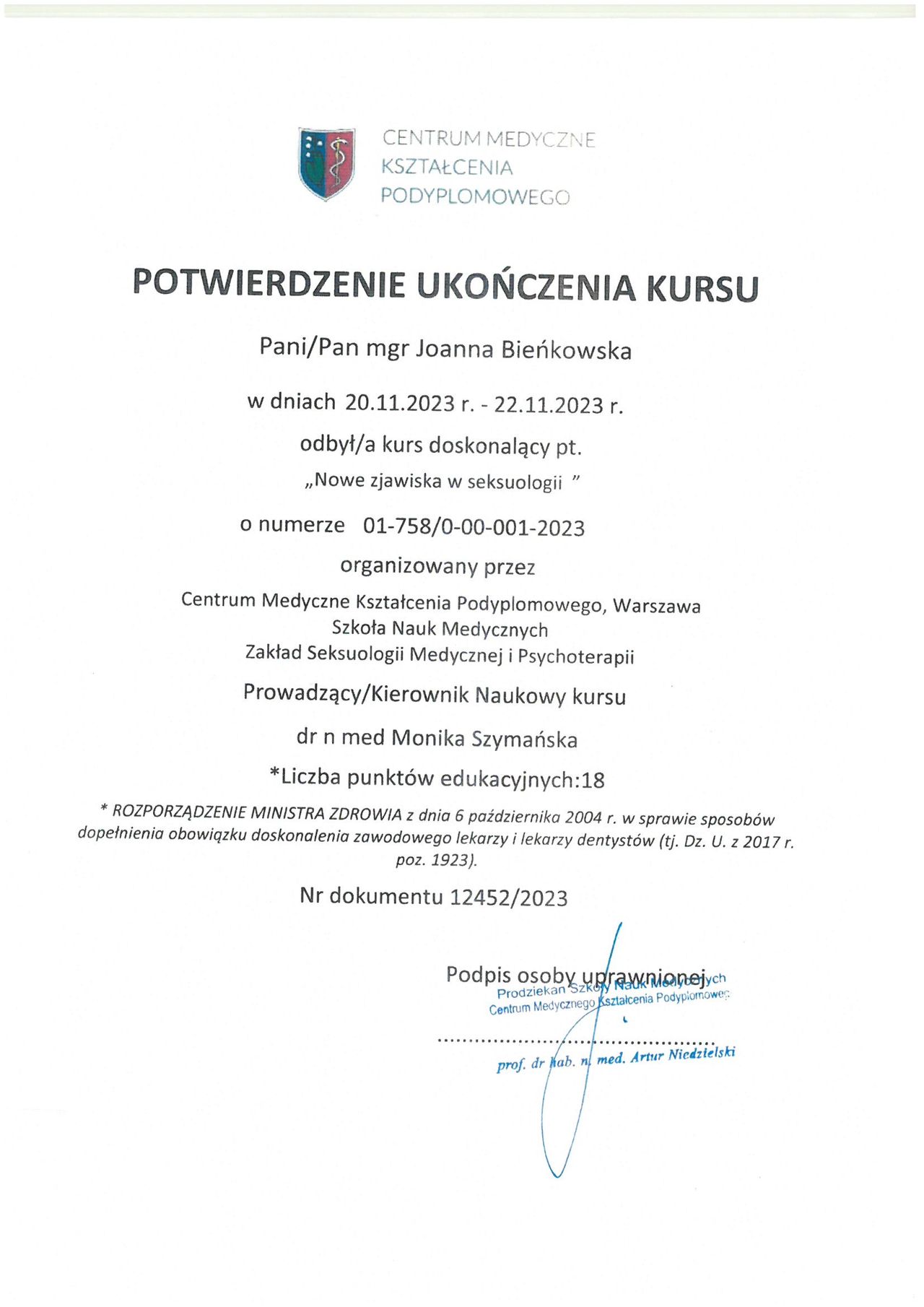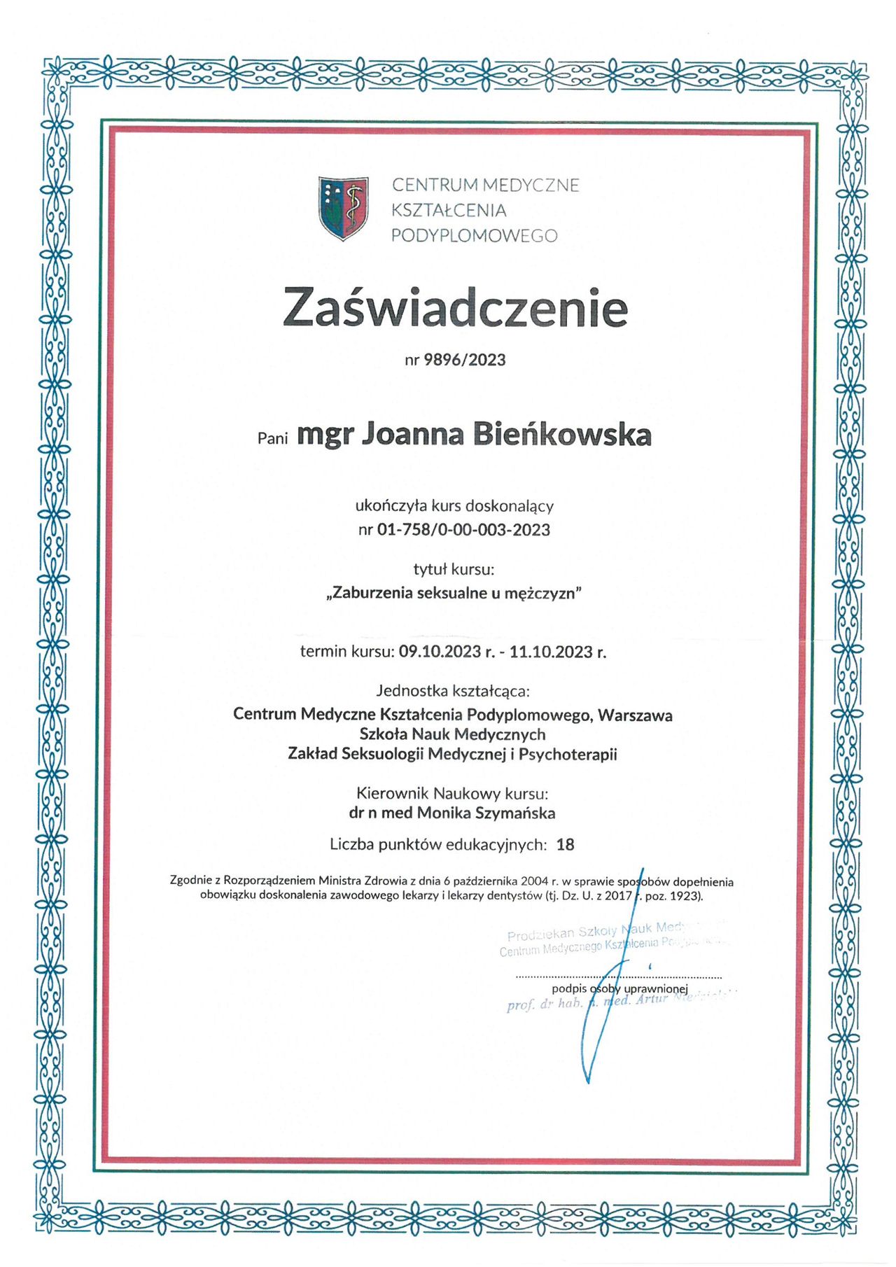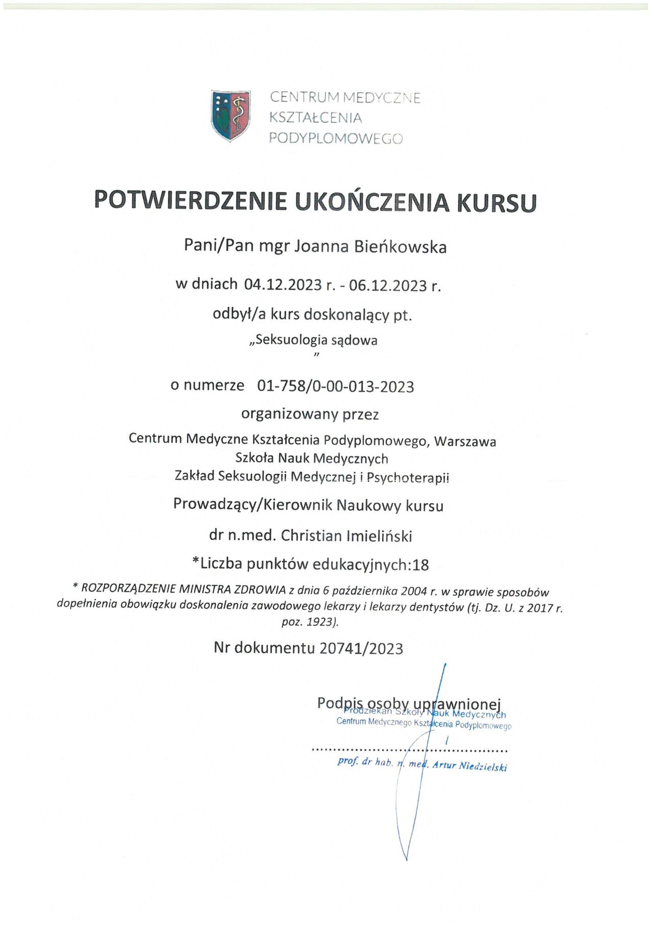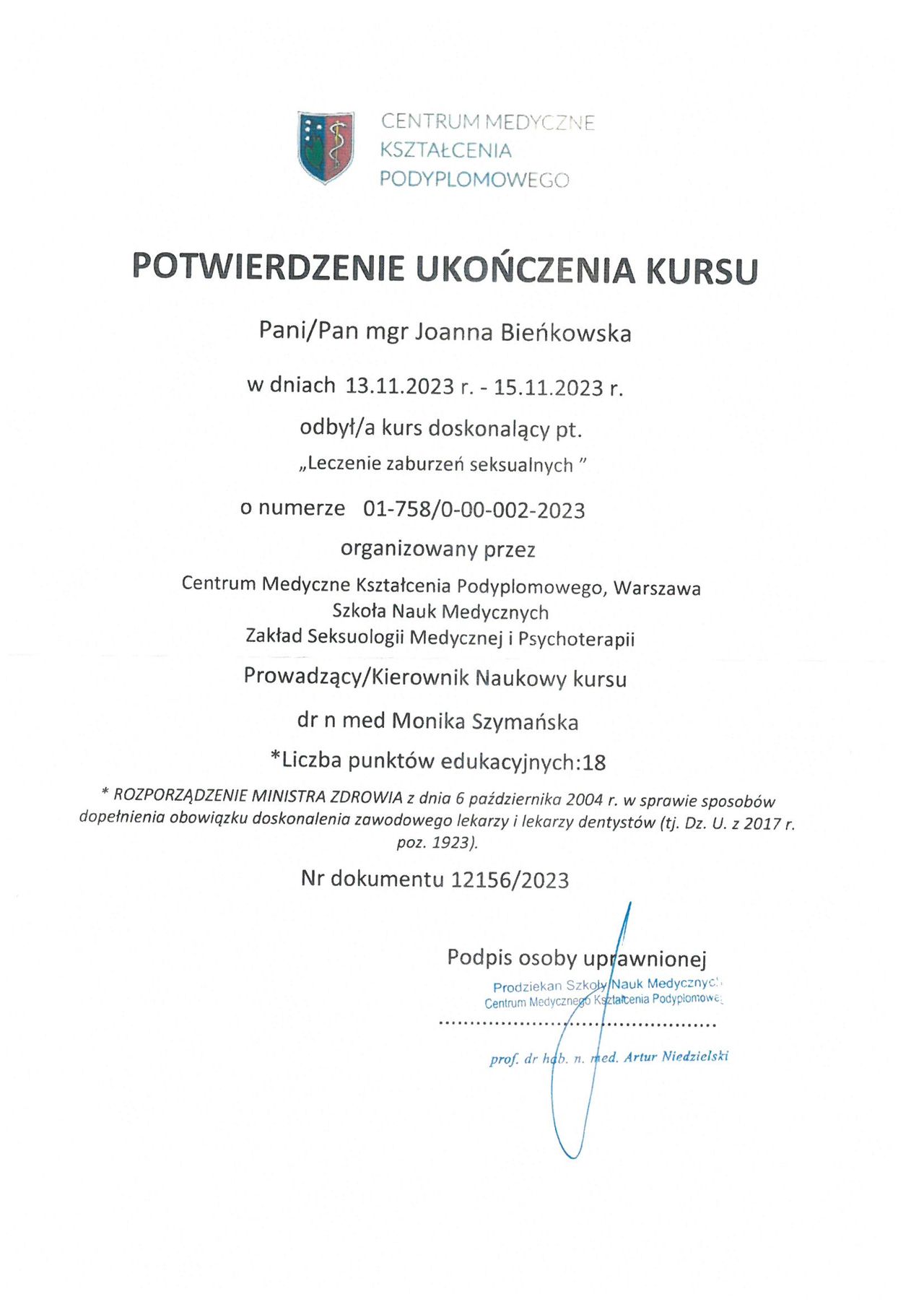 Jestem pedagogiem, psychologiem, socjoterapeutą oraz psychoterapeutą psychodynamicznym w procesie certyfikacji. Kurs Psychoterapii Psychodynamicznej ukończyłam w Centrum Doskonalenia i Leczenia Psychodynamicznego w Krakowie (obecnie KCP) w 2000 roku. Ukończyłam studia podyplomowe z Wychowania prorodzinnego i seksualnego, Psychologii zwierząt oraz szkolenia z Socjoterapii i Psychologicznego Treningu Grupowego. Brałam również udział w kursach Seksuologii w Centrum Medycznym Kształcenia Podyplomowego oraz w wielu kursach doszkalających dla psychologów i psychoterapeutów. Jestem członkiem Polskiego Towarzystwa Psychoterapii Psychodynamicznej. Jako psychoterapeuta, dbając o siebie i moich Pacjentów, biorę udział w regularnych superwizjach indywidualnych i grupowych oraz terapii własnej.