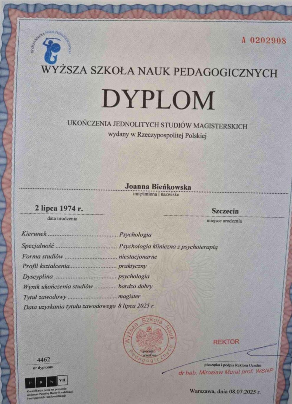 Pani Joanna jest świetną i empatyczną specjalistką, o ogromnej wiedzy i zaangażowaniu. Mam pewne problemy związane z wyrażaniem i kontrolą emocji, lecz dzięki spotkaniom z Panią Joanną Bieńkowską powoli zaczynam odzyskiwać ulgę i wewnętrzną równowagę.