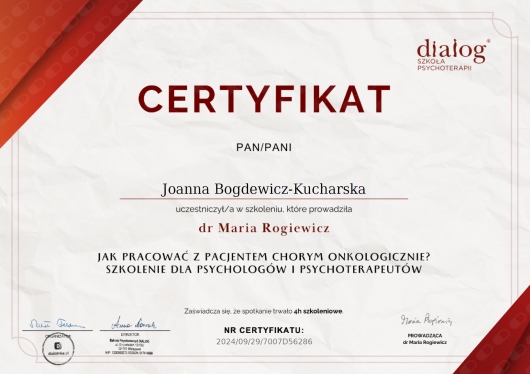 Jaki jest zakres porad oferowanych przez Joanna Bogdewicz-Kucharska?Joanna Bogdewicz-Kucharska to psycholog. Na podstawie swojego doświadczenia i wykształcenia Joanna Bogdewicz-Kucharska oferuje usługi takie jak: Konsultacja psychologiczna, konsultacja psychologa - telemedycyna.