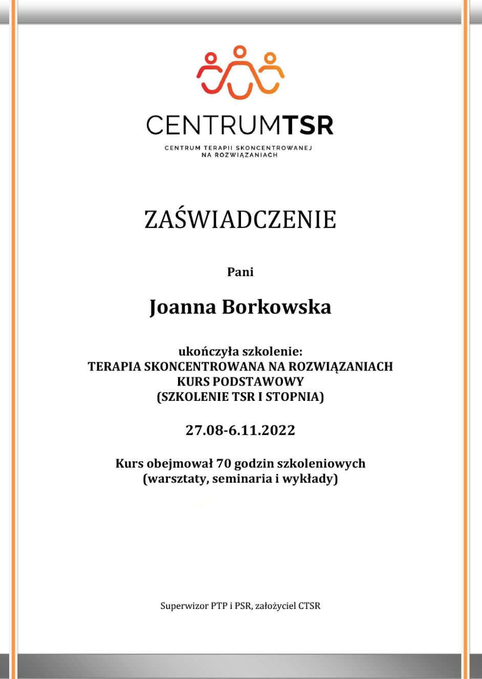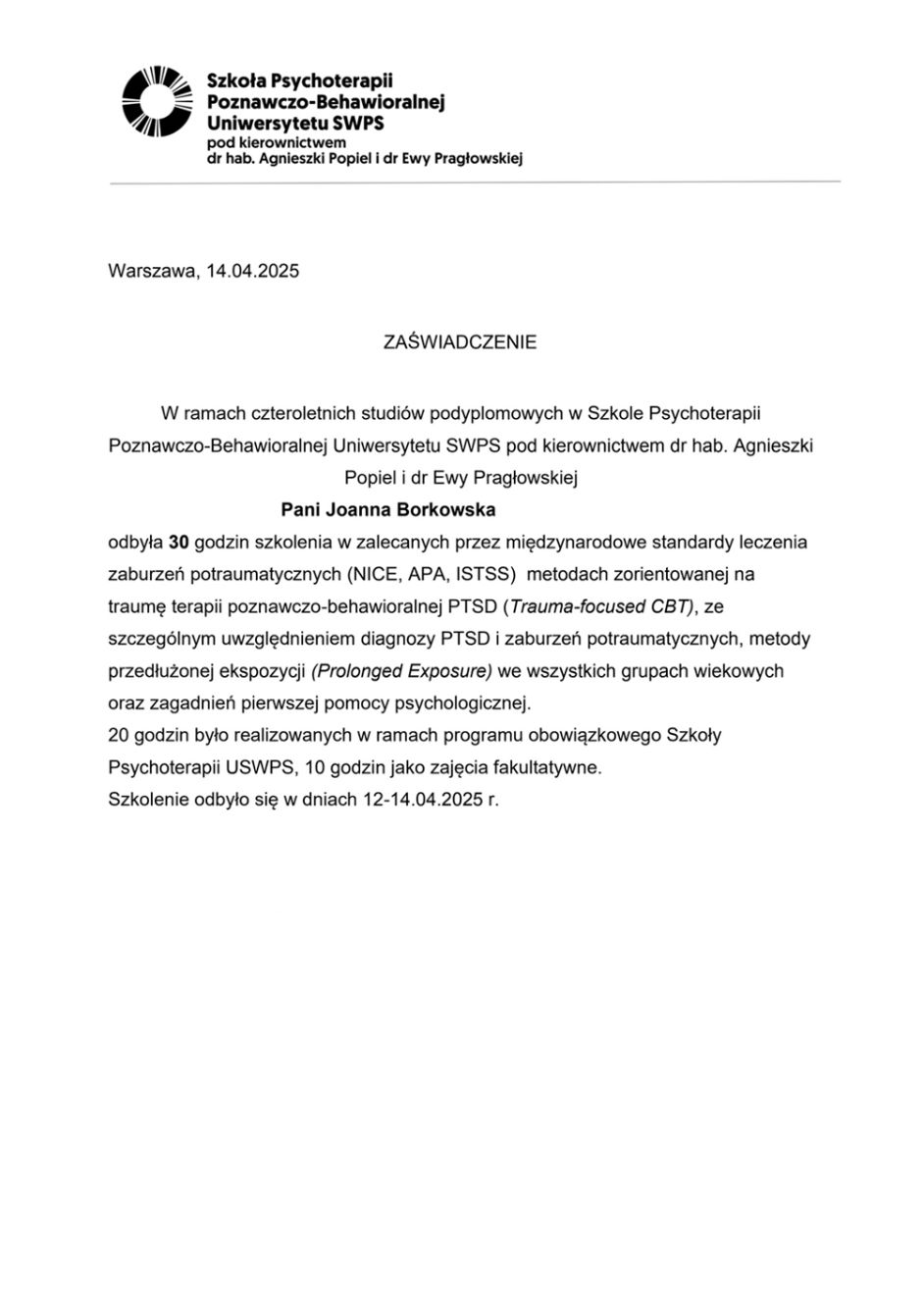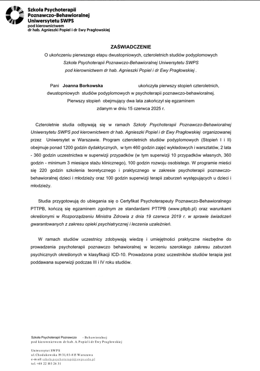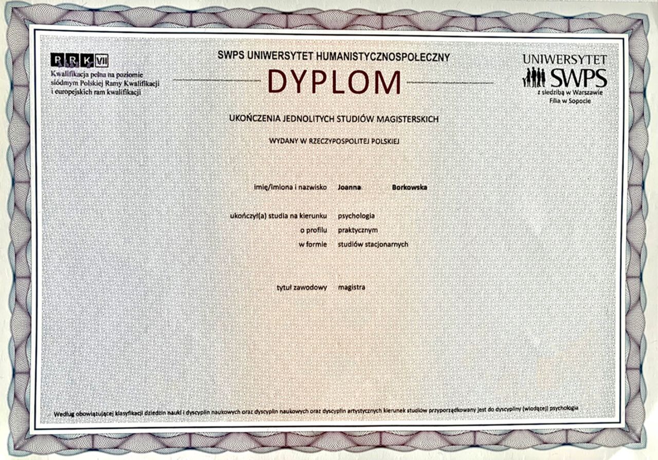 Ukończyłam pięcioletnie studia magisterskie z zakresu Psychologii Klinicznej i Zdrowia na Uniwersytecie Humanistyczno-Społecznym SWPS w Sopocie. Obecnie jestem w trakcie procesu szkolenia w Szkole Psychoterapii Poznawczo-Behawioralnej Uniwerystetu SWPS pod kierownictwem dr hab. Agnieszki Popiel i dr Ewy Pragłowskiej, a także członkinią Polskiego Towarzystwa Psychoterapii Poznawczej i Behawioralnej im. Prof. Zdzisława Bizonia.