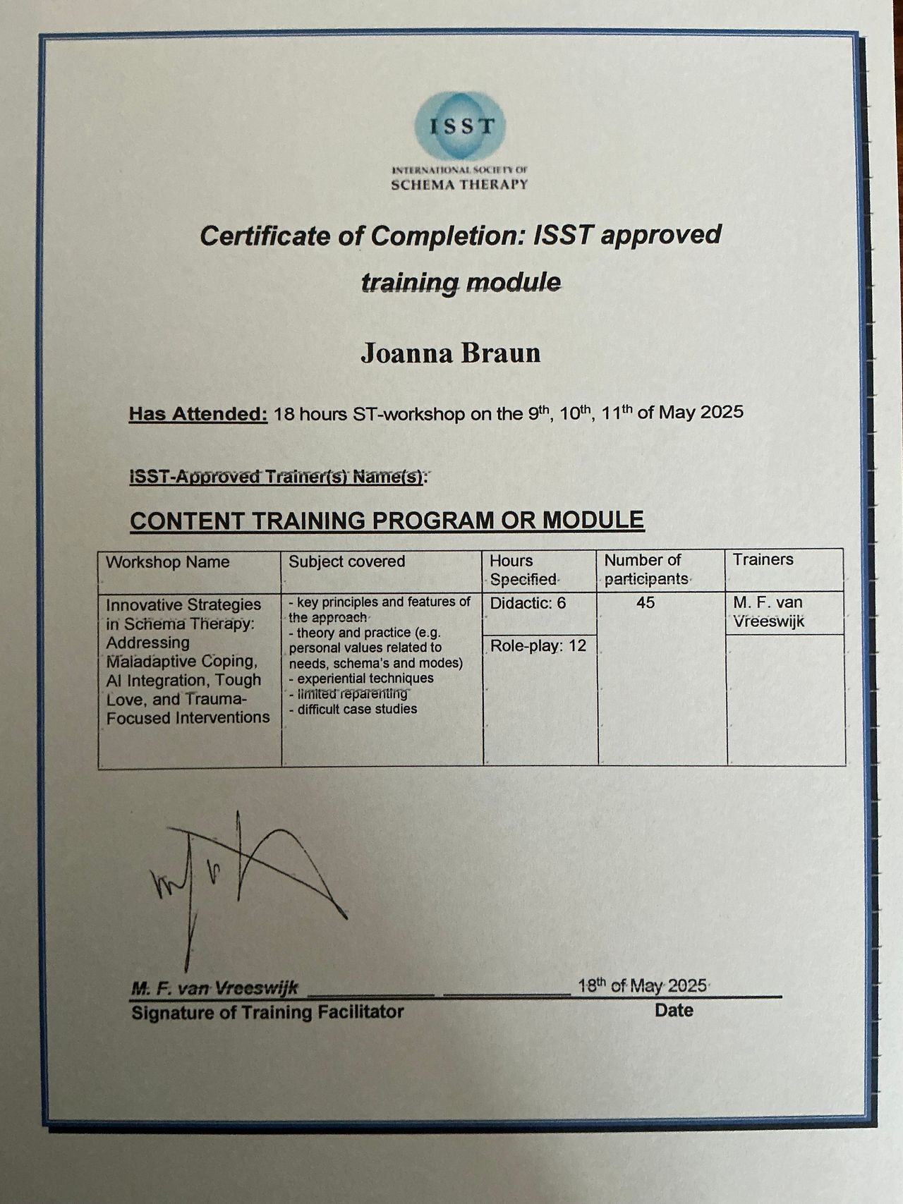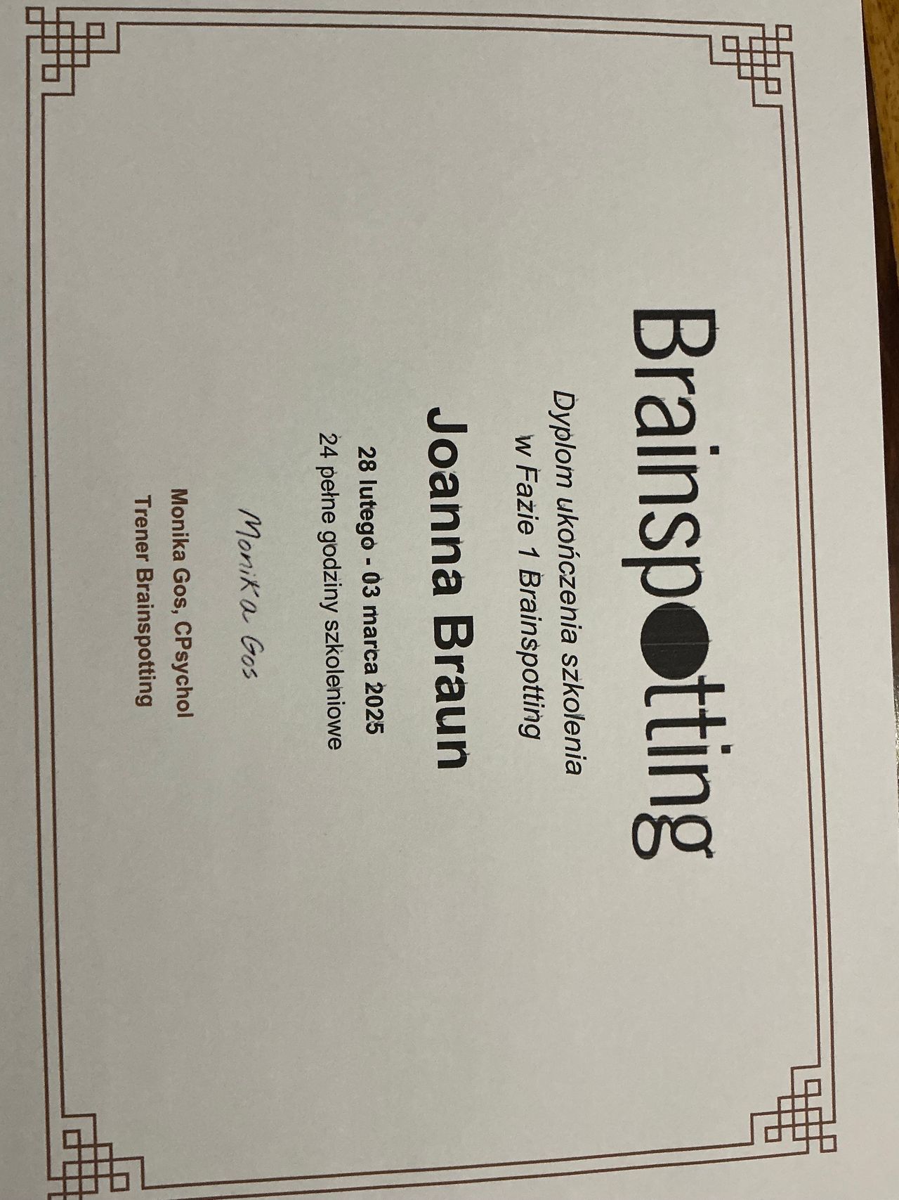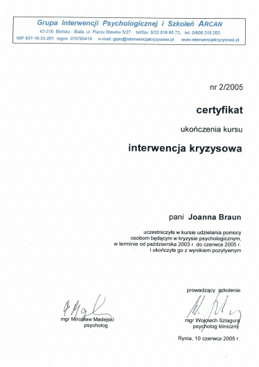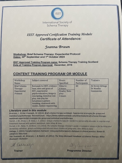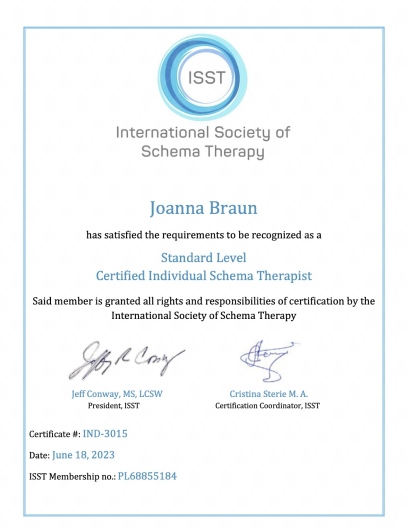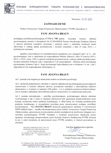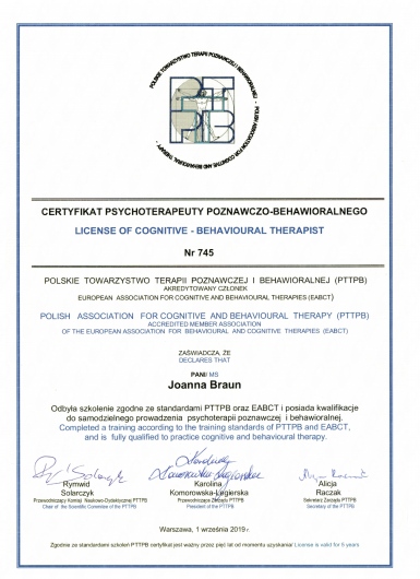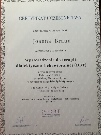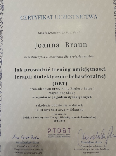 w Sopocie, pod kierownictwem dr Agnieszki Popiel i dr Ewy Pragłowskiej i uzyskałam Certyfikat Psychoterapeuty Poznawczo-Behawioralnego PTTPB /nr certyfikatu:745/. Ukończyłam całościowe szkolenie z zakresu terapii schematu - Instytut Terapii Schematu i uzyskałam certyfikat indywidualnego terapeuty schematu //IND-3015//. Obecnie uczestniczę w szkoleniu z terapii schematu dla par - Instytut Terapii Schematu; Rozwijam również swoje umiejętności uczestnicząc w szkoleniach poświęconych Terapii Akceptacji i Zaangażowania (ACT) oraz Terapii Dialektyczno Behawioralnej (DBT).
