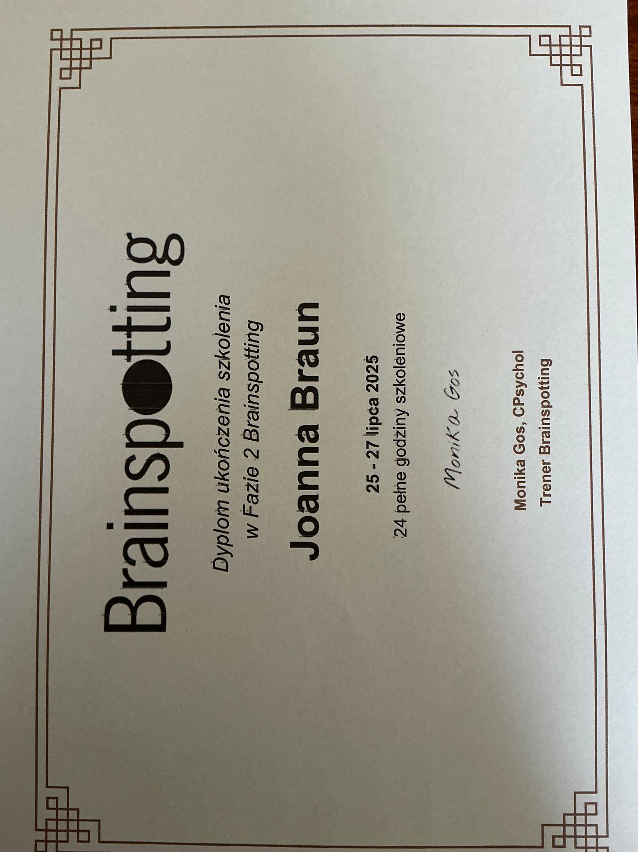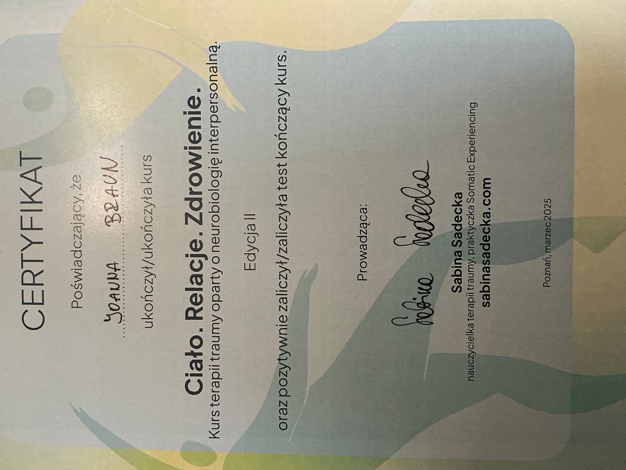 Ukończyłam 4 letnie dwustopniowe studia podyplomowe z zakresu psychoterapii -Szkoła Psychoterapii Poznawczo – Behawioralnej - realizowane przez SWPS Uniwersytet Humanistycznospołeczny - Wydział