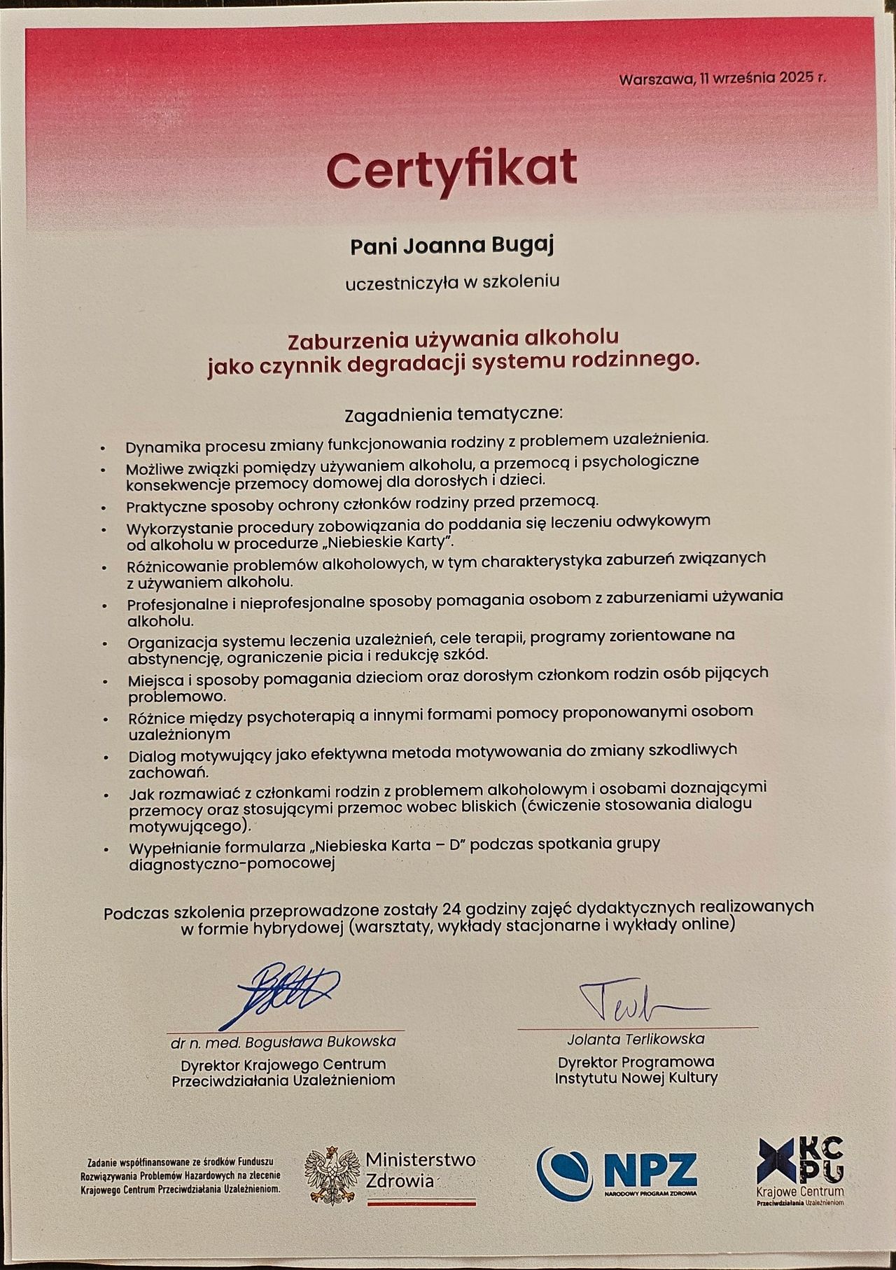 Jaki jest zakres porad oferowanych przez Joanna Bugaj?Joanna Bugaj to psycholog. Na podstawie swojego doświadczenia i wykształcenia Joanna Bugaj oferuje usługi takie jak: Konsultacja psychologiczna, interwencja kryzysowa, Diagnoza CAPD – zaburzeń centralnego przetwarzania słuchowego, diagnoza zaburzeń osobowości, Diagnoza osobowości NEO-PI-R, diagnoza przyczyn niepowodzeń szkolnych, diagnoza depresji, mediacje rodzinne, Diagnoza zaburzeń lękowych - STAI, poradnictwo dla rodziców.