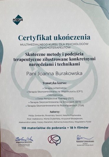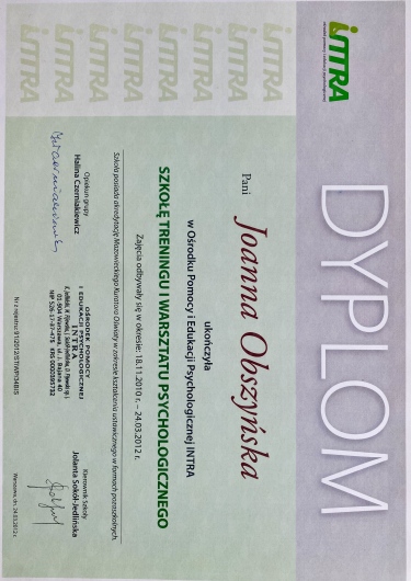 Jestem psychologiem i psychoterapeutką w trakcie szkolenia. Ukończyłam studia psychologiczne na Uniwersytecie SWPS w Warszawie, realizowane w całości w języku angielskim. Następnie uzyskałam tytuł trenera umiejętności społecznych w Ośrodku Pomocy i Edukacji Psychologicznej INTRA. Aktualnie jestem w trakcie kończenia 4-letniego szkolenia psychoterapeutycznego w nurcie poznawczo-behawioralnym w Centrum Terapii Poznawczo Behawioralnej w Warszawie.