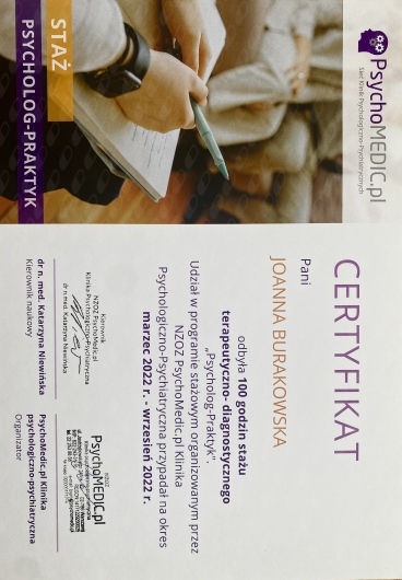 Doświadczenie kliniczne zdobywałam w Instytucie Psychiatrii i Neurologii w Warszawie w Klinice Nerwic, Zaburzeń Osobowości i Zaburzeń Odżywiania. Odbyłam również staż diagnostyczny CBT w Poradni Zdrowia Psychicznego PsychoMedic w Warszawie.