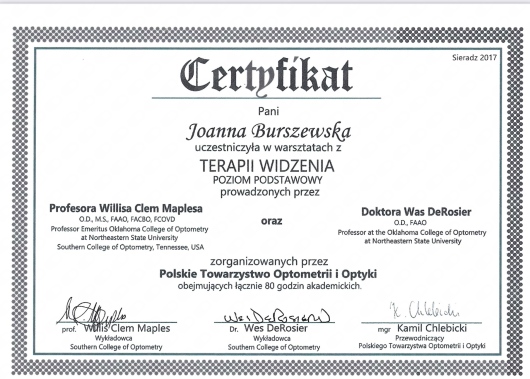 W 2012 roku ukończyłam Studia Podyplomowe z Optometrii na Politechnice Wrocławskiej. Zajmuję się badaniem wzroku, doborem korekcji okularowej i aplikacją soczewek kontaktowych, a także oceną stanu widzenia obuocznego i terapią widzenia u dzieci (od 4 r.ż.) i dorosłych.