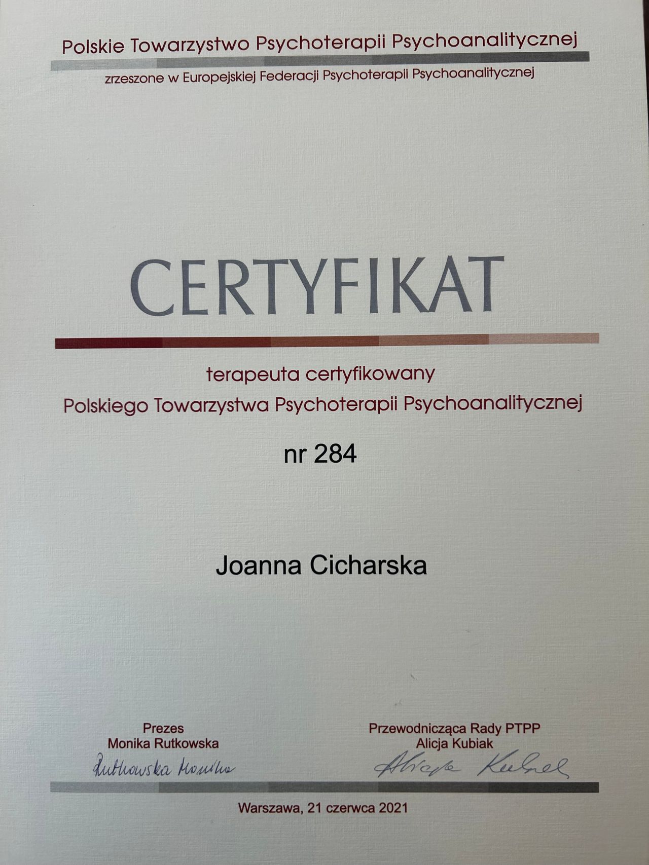 Jestem certyfikowaną psychoterapeutką psychoanalityczną, członkiem zwyczajnym Polskiego Towarzystwa Psychoterapii Psychoanalitycznej ( https://ptpp.pl ). Pracuję zgodnie ze standardami etycznymi tego Towarzystwa. Swoją pracę poddaję regularnej superwizji.