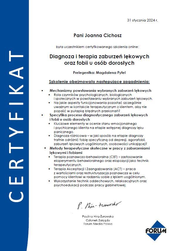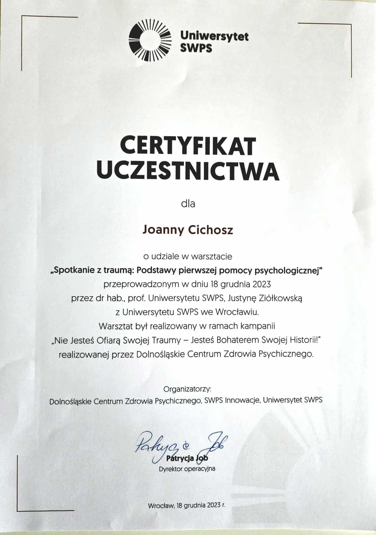Ukończyłam 8-miesięczne szkolenie z interwencji kryzysowej prowadzone przez Instytut Terapii Poznawczo-Behawioralnej, które pozwoliło mi poszerzyć wiedzę i umiejętności w pracy z osobami w trudnych momentach życiowych.