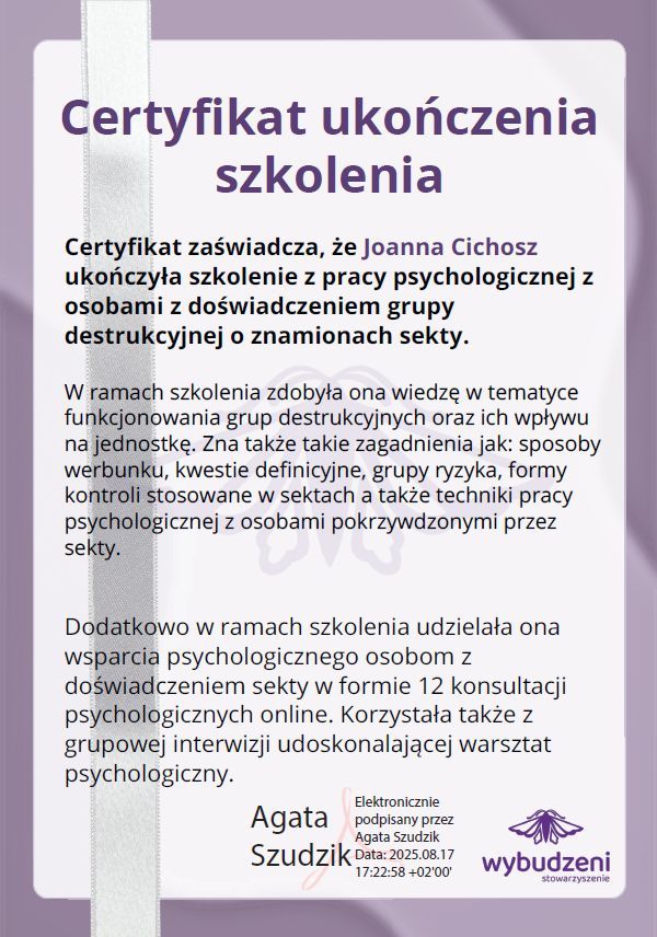 Jestem psycholożką, absolwentką Uniwersytetu SWPS we Wrocławiu na specjalności psychologia kliniczna, którą ukończyłam z wyróżnieniem. Doświadczenie zawodowe zdobywałam m.in. na Oddziale Całodobowym Kliniki Psychiatrii Uniwersyteckiego Szpitala Klinicznego we Wrocławiu oraz w Stowarzyszeniu „Wybudzeni”, w której wspieram osoby z doświadczeniem uczestnictwa w grupach destrukcyjnych o znamionach sekty (np. Świadkowie Jehowy, systemy MLM) w procesie odbudowy życia po odejściu z grupy destrukcyjnej.