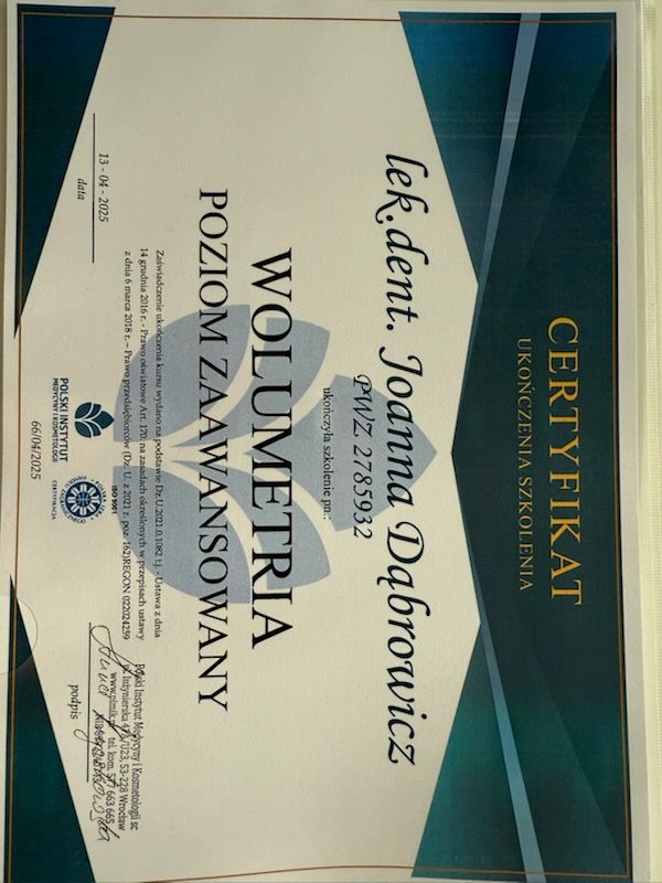 Jestem pod ogromnym wrażeniem podejścia do pacjenta, fachowości i niesamowitego profesjonalizmu dr Joanny Dąbrowicz. Całkowicie zaangażowana w swoją pracę, nieprawdopodobnie empatyczna pani doktor z cudownym podejściem do człowieka. Indywidualne podejście do problemu pacjenta, rzeczowe wyjaśnienie wszelkich zagadnień i tematów, sprawiają, że pacjent czuje się w tym gabinecie wręcz komfortowo. Dziękuję serdecznie za piękny uśmiech. Jestem mega zadowolona i serdecznie polecam! Jestem zachwycona życzliwością, cierpliwością, a przede wszystkim pełnym profesjonalizmem wykonywanych zabiegów. Dr Asiu, jest Pani najlepsza