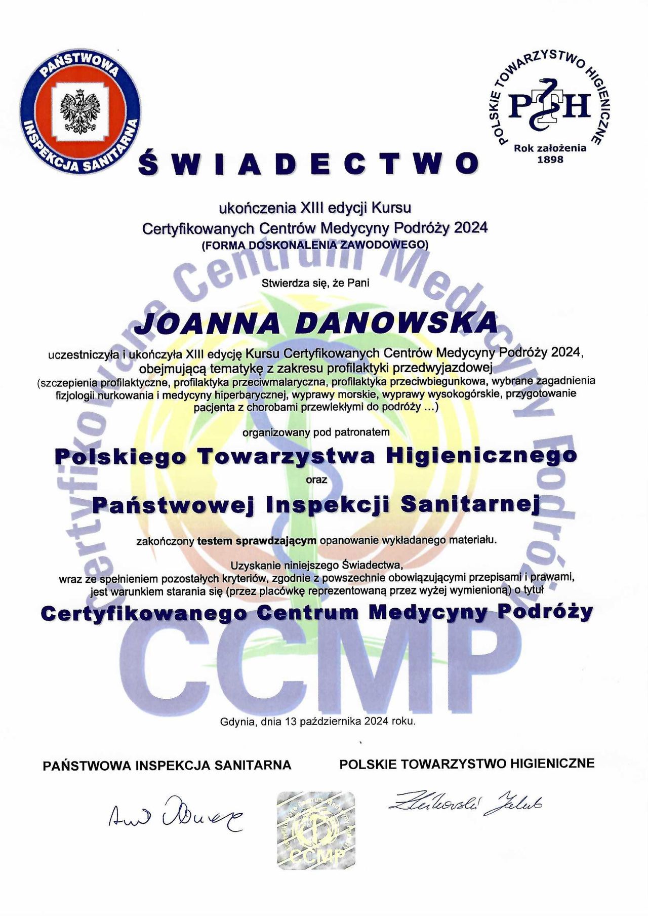 Uzyskałam certyfikat z zakresu medycyny podróży, co pozwala mi na prowadzenie konsultacji dotyczących profilaktyki zdrowotnej przed wyjazdami zagranicznymi.