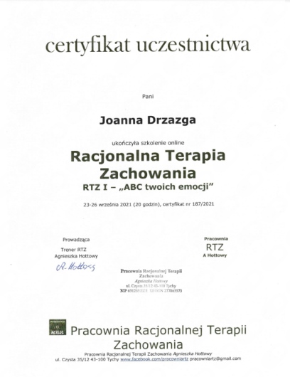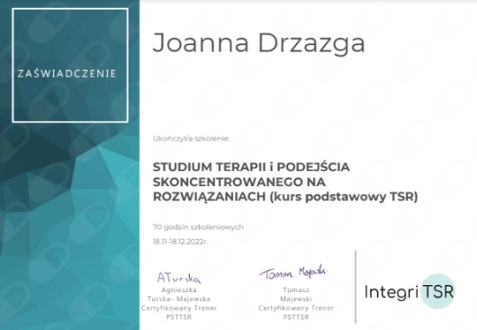 Studia psychologiczne o specjalności klinicznej człowieka dorosłego ukończyłam na Uniwersytecie SWPS. Ukończyłam również kursy I stopnia z Terapii Skoncentrowanej na Rozwiązaniach oraz Racjonalnej Terapii Zachowania. Od października 2023 r. jestem uczestnikiem 4-letniego szkolenia w Szkole Psychoterapii Poznawczo-Behawioralnej w Instytucie Poznawczym w Krakowie.