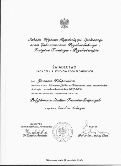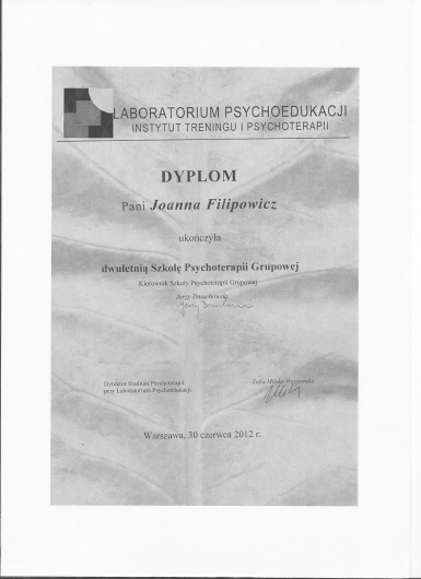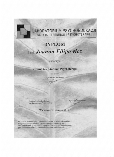 Miałam przyjemność pracować z Panią Joanna przez dłuższy czas. Jest osoba bardzo kompetentna, ciepła i wyrozumiala. Pomogła mi przejść przez różne tematy. Było czuć i widać zaangażowanie ze strony Pani Joanny. To był bardzo cenny czas dla mnie. Nie często spotyka się takich ludzi na swojej drodze. Bardzo się cieszę ze trafiłam akurat na Panią Joanne Filipowicz.