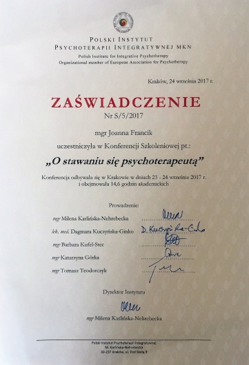 Ukończyłam 4-letnie szkolenie w Polskim Instytucie Psychoterapii Integratywnej oraz Podyplomowe Szkolenie w zakresie Psychoterapii w Collegium Medicum Uniwersytetu Jagiellońskiego.