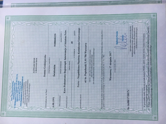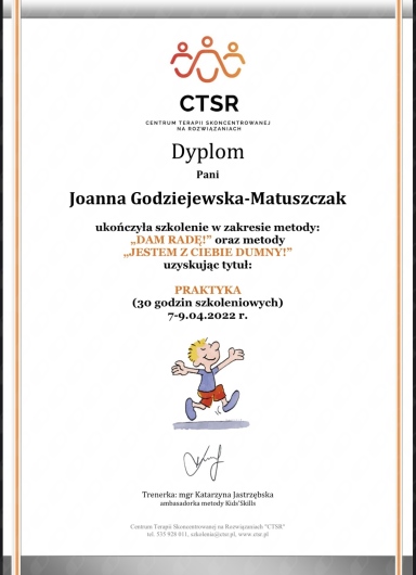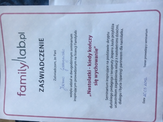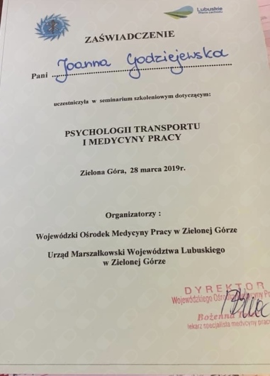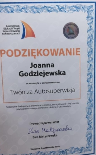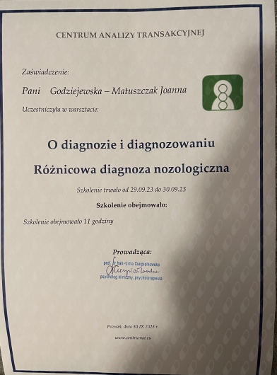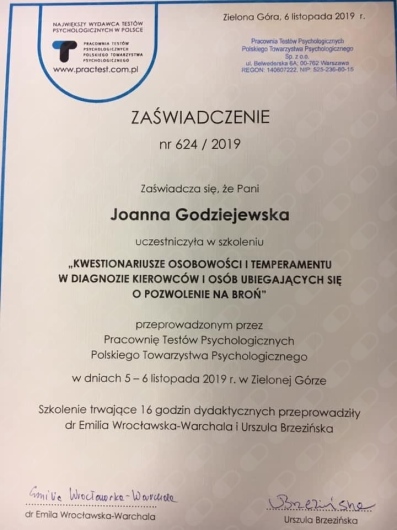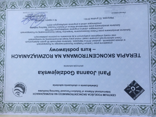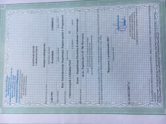 Ukończyłam pierwszy stopień certyfikacji programu licencyjnego w zakresie psychoterapii w Instytucie Psychologii Procesu w Warszawie. Kontynuuję serię szkoleń z zakresu Terapii Skoncentrowanej na Rozwiązaniach w Centrum PSR/TSR, również w Warszawie. Uczestniczę w wielu szkoleniach, warsztatach i kursach w celu podniesienia swoich kwalifikacji i kompetencji. Ukończyłam studia podyplomowe na kierunku psychologia transportu zdobywając uprawnienia do badań psychologicznych(psychotechnicznych) z zakresu psychologii transportu i medycyny pracy.