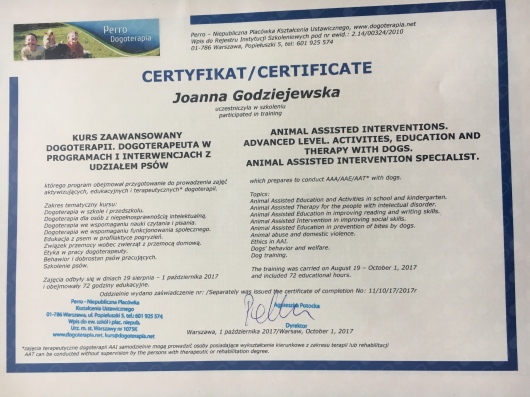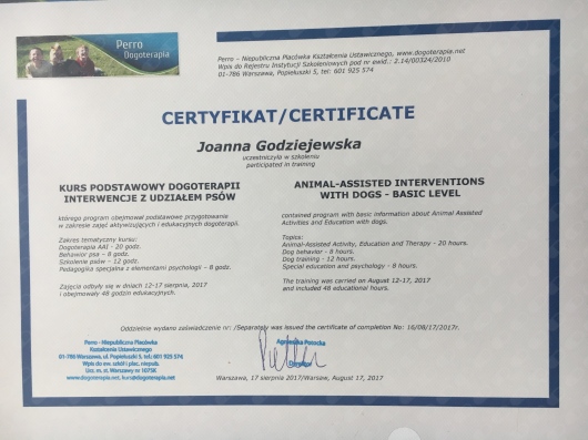 Jestem licencjonowanym kynoterapeutą. Podczas zajęć dogoterapeutycznych pracuję z udziałem psa rasy golden retriever o imieniu Klemens. Licencję dogoterapeuty uzyskałam podczas szkolenia w Niepublicznej Placówce Kształcenia Ustawicznego Perro w Warszawie.
