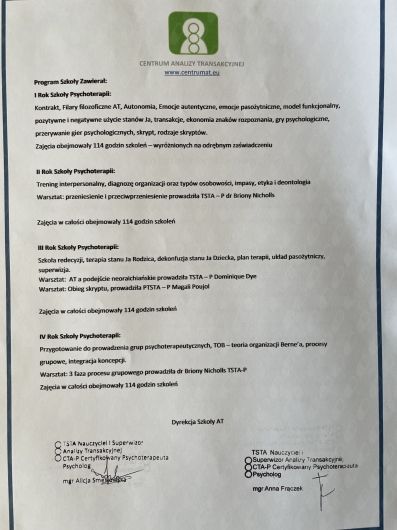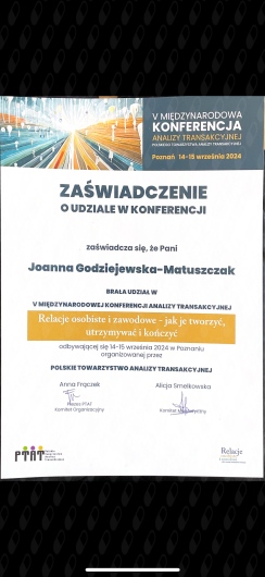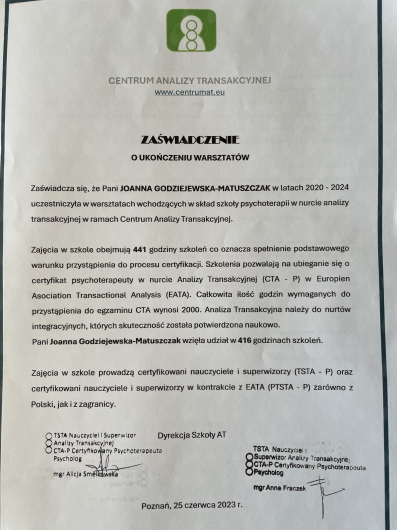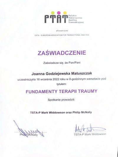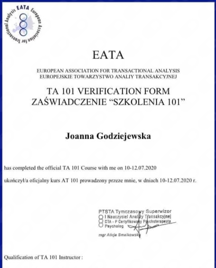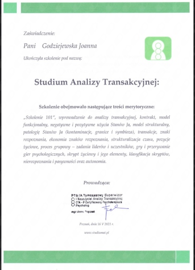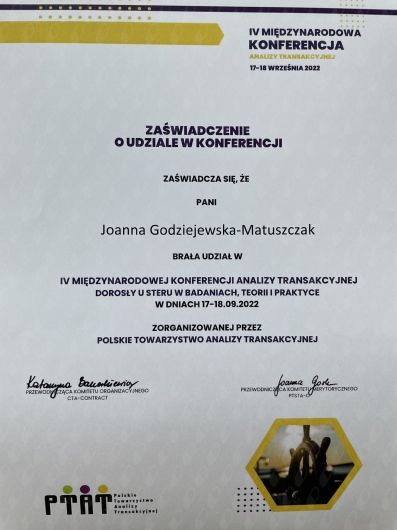 Jestem członkiem Polskiego Towarzystwa Analizy Transakcyjnej.