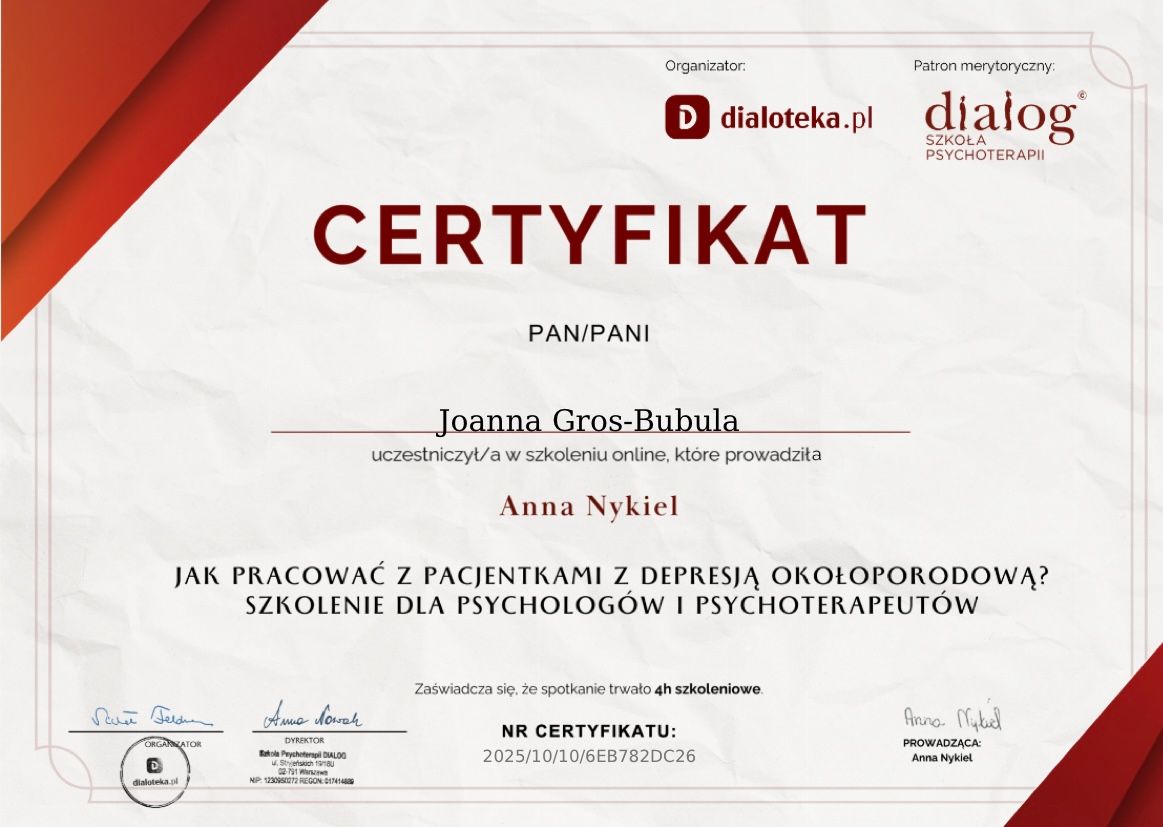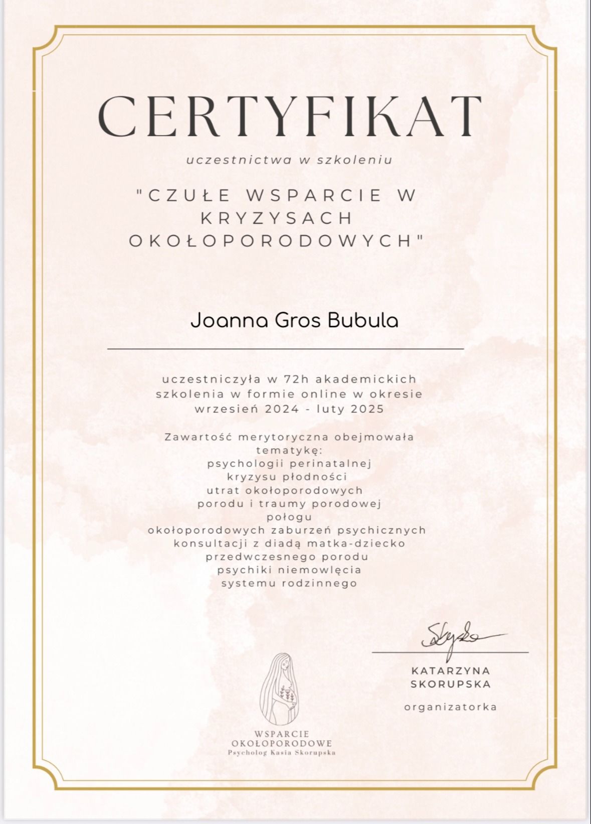 Jaki jest zakres porad oferowanych przez Joanna Gros-Bubula?Joanna Gros-Bubula to psycholog. Na podstawie swojego doświadczenia i wykształcenia Joanna Gros-Bubula oferuje usługi takie jak: Konsultacja psychologiczna, Psychoterapia poznawczo-behawioralna, konsultacja dla kobiet w ciąży i po porodzie.