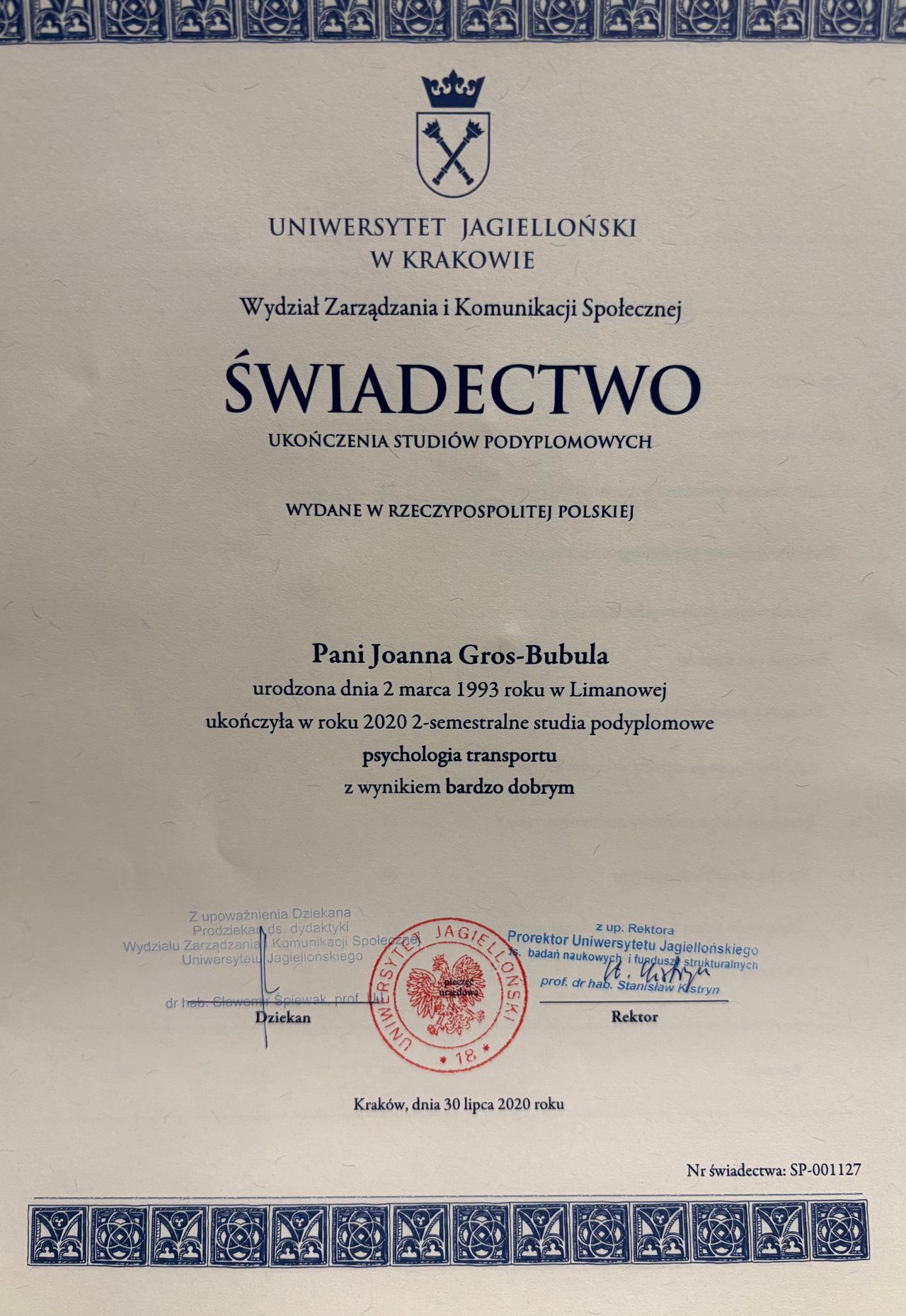 Jestem psychologiem o specjalności klinicznej i osobowości. Ukończyłam studia podyplomowe z psychologii transportu na Uniwersytecie Jagiellońskim, a obecnie kształcę się w 4-letniej szkole psychoterapii poznawczo-behawioralnej w ośrodku akredytowanym Tercognitiva.