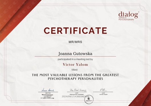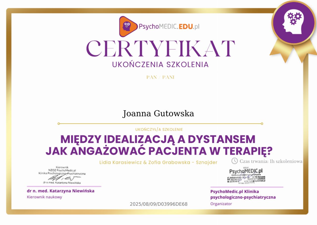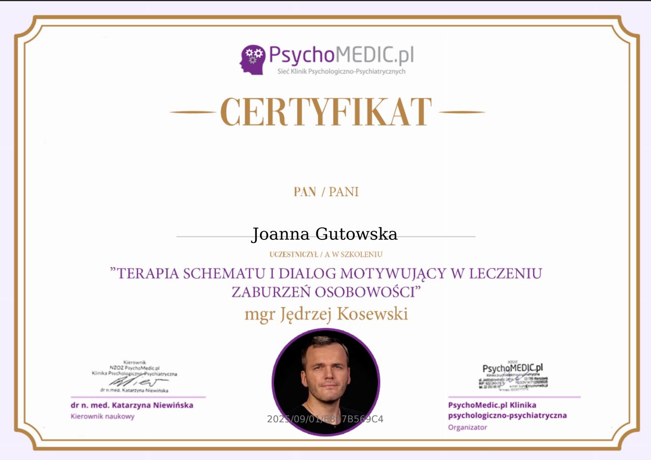 Z całego serca polecam panią Joannę, jestem pod ogromnym wrażeniem jej zaangażowania, kultury osobistej i wiedzy. Podczas wizyt czuję się wyjątkowo komfortowo, nie czuję się oceniana, nie mam problemu z tym, aby się otworzyć, co było dla mnie zawsze trudne podczas doświadczeń z innymi terapeutami. Dzięki pani Joannie z dużo większą nadzieją patrzę w przyszłość i widzę przysłowiowe światełko w tunelu. Polecam każdemu, kto szuka terapeuty zaangażowanego, empatycznego, i przede wszystkim skutecznego.