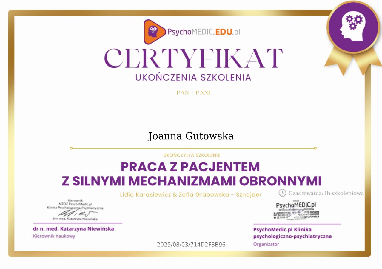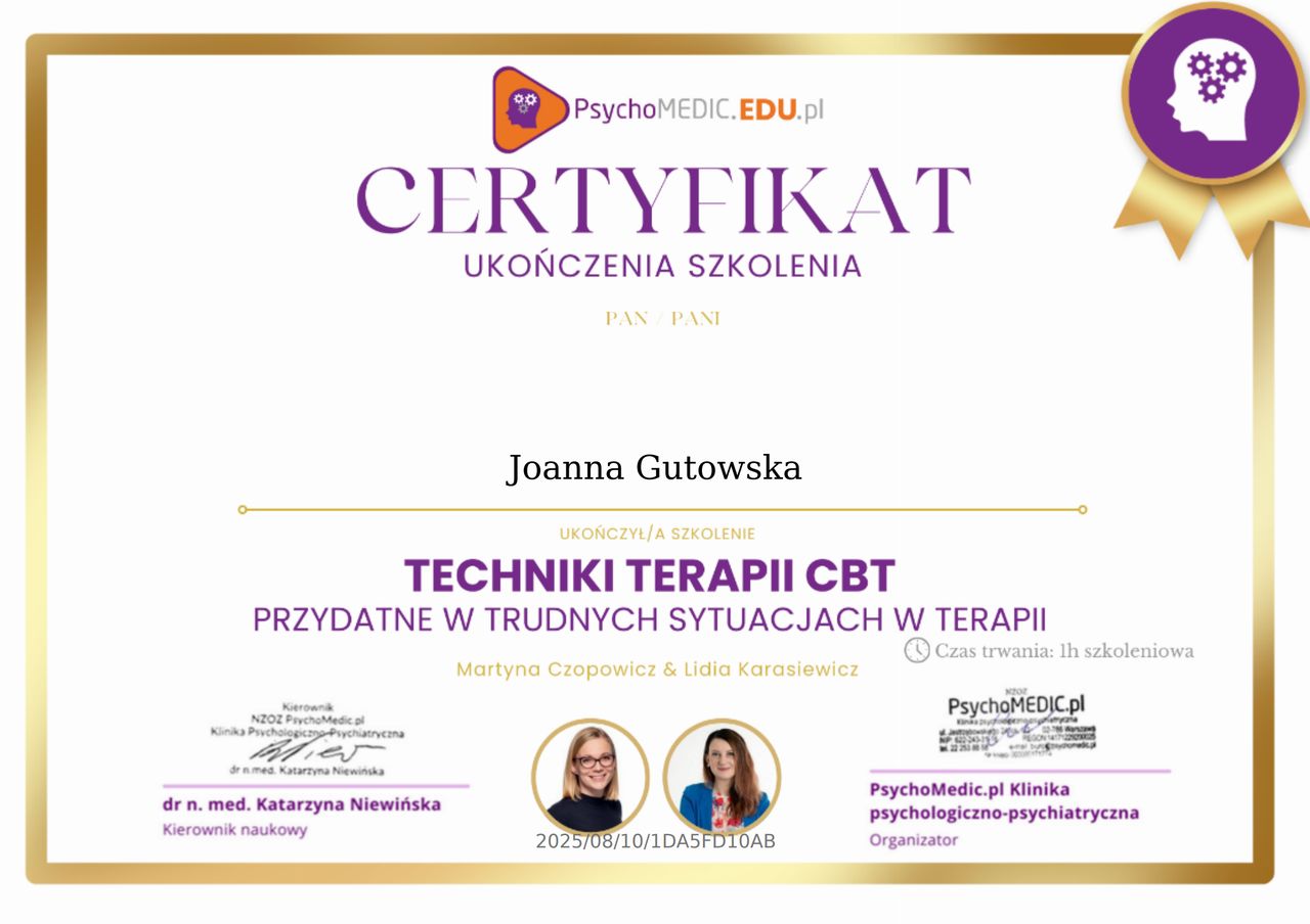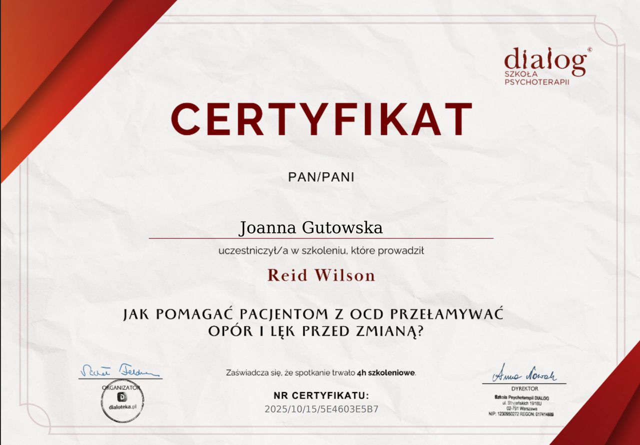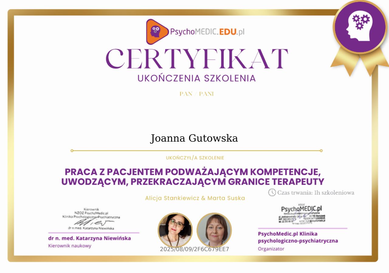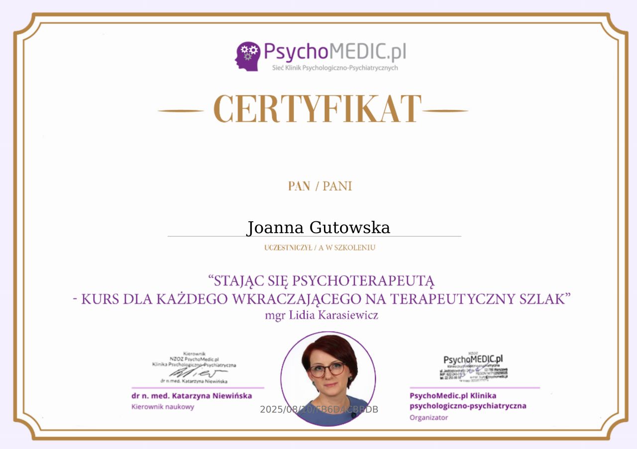 Z całego serca polecam terapię u Pani Joanny. Trafiłam do gabinetu w bardzo trudnym momencie – towarzyszyły mi niepokojące objawy psychosomatyczne, lęk, napięcie i ciągłe zamartwianie się o zdrowie. Dzięki profesjonalnemu i jednocześnie bardzo empatycznemu podejściu Pani Joanny, krok po kroku zaczęłam rozumieć źródła moich trudności i uczyć się, jak sobie z nimi radzić.