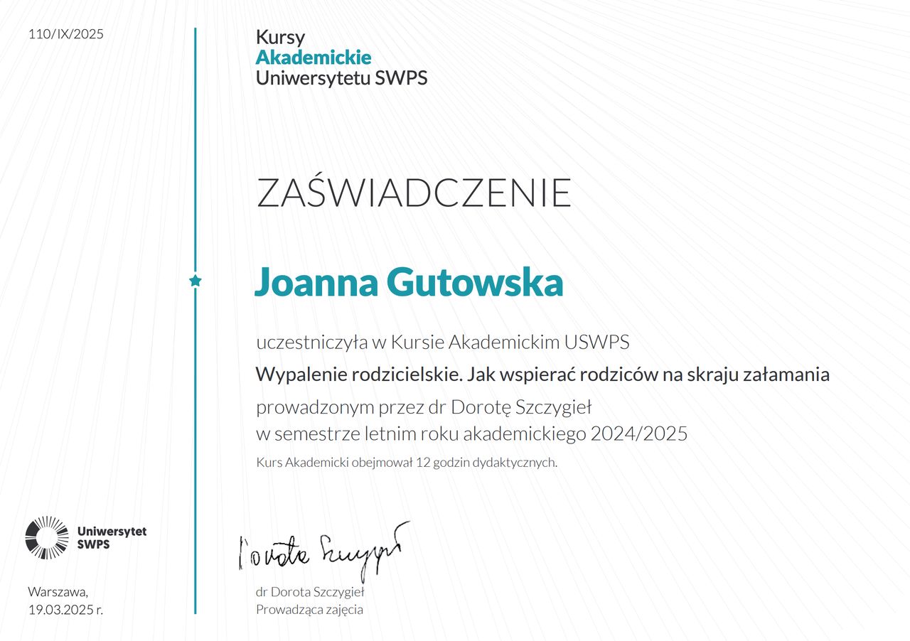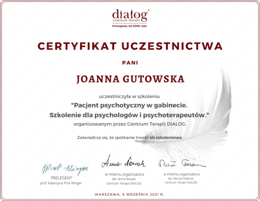 Jaki jest zakres porad oferowanych przez Joanna Gutowska?Joanna Gutowska to psycholog. Na podstawie swojego doświadczenia i wykształcenia Joanna Gutowska oferuje usługi takie jak: Konsultacja psychologiczna, Psychoterapia, konsultacja psychologiczna w j. angielskim, Konsultacja psychoterapeutyczna po angielsku, psychological consultation in English, psychoterapia w języku angielskim, psychotherapeutic consultation in English, Konsultacja psychologiczna dla par, Terapia par (dłuższa), Terapia par (krótsza).