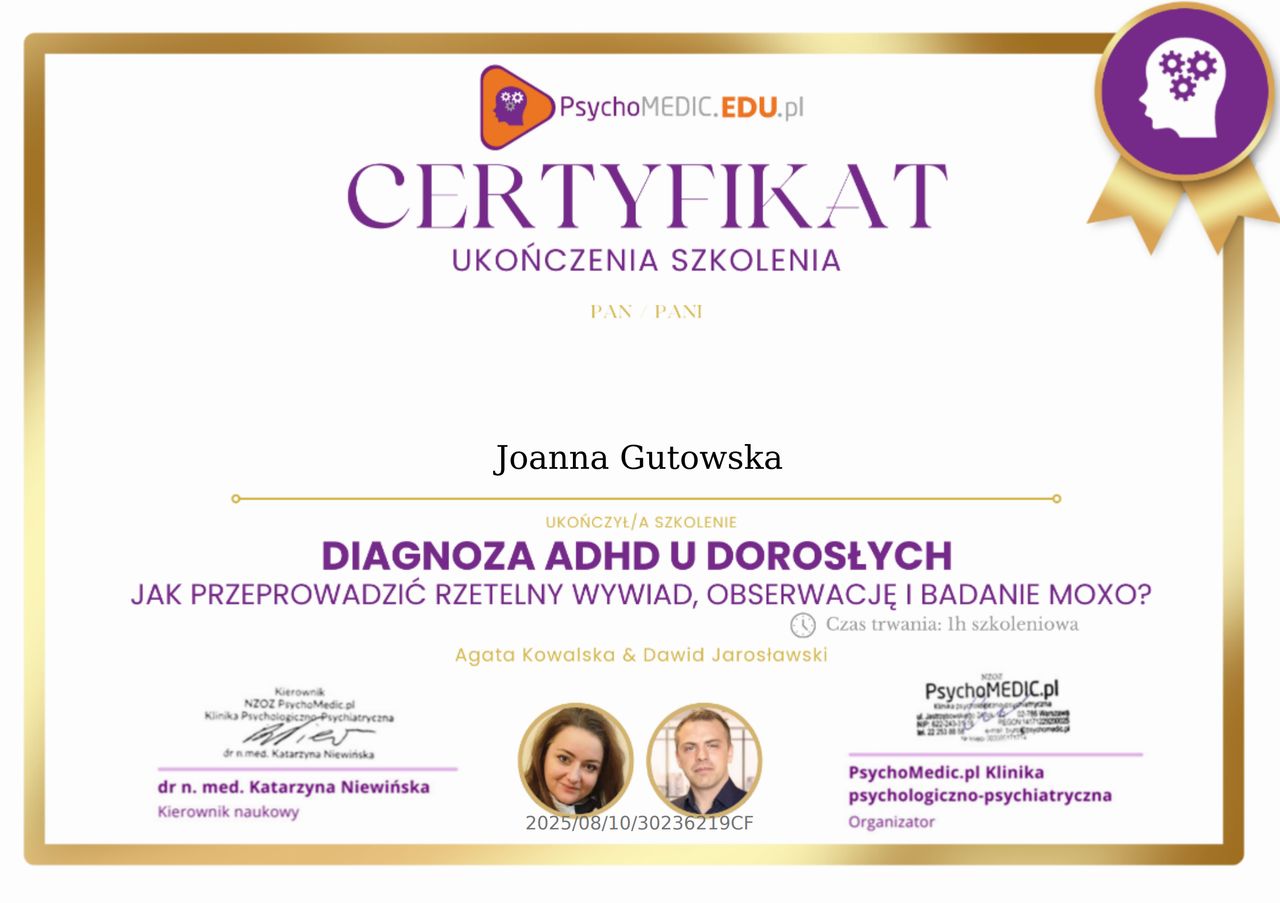 Czy Joanna Gutowska przyjmuje online, bez konieczności pojawiania się w placówce?Tak, Joanna Gutowska oferuje konsultacje online. Wybierz opcję „konsultacja online” przy umawianiu wizyty, a zobaczysz dostępne terminy.